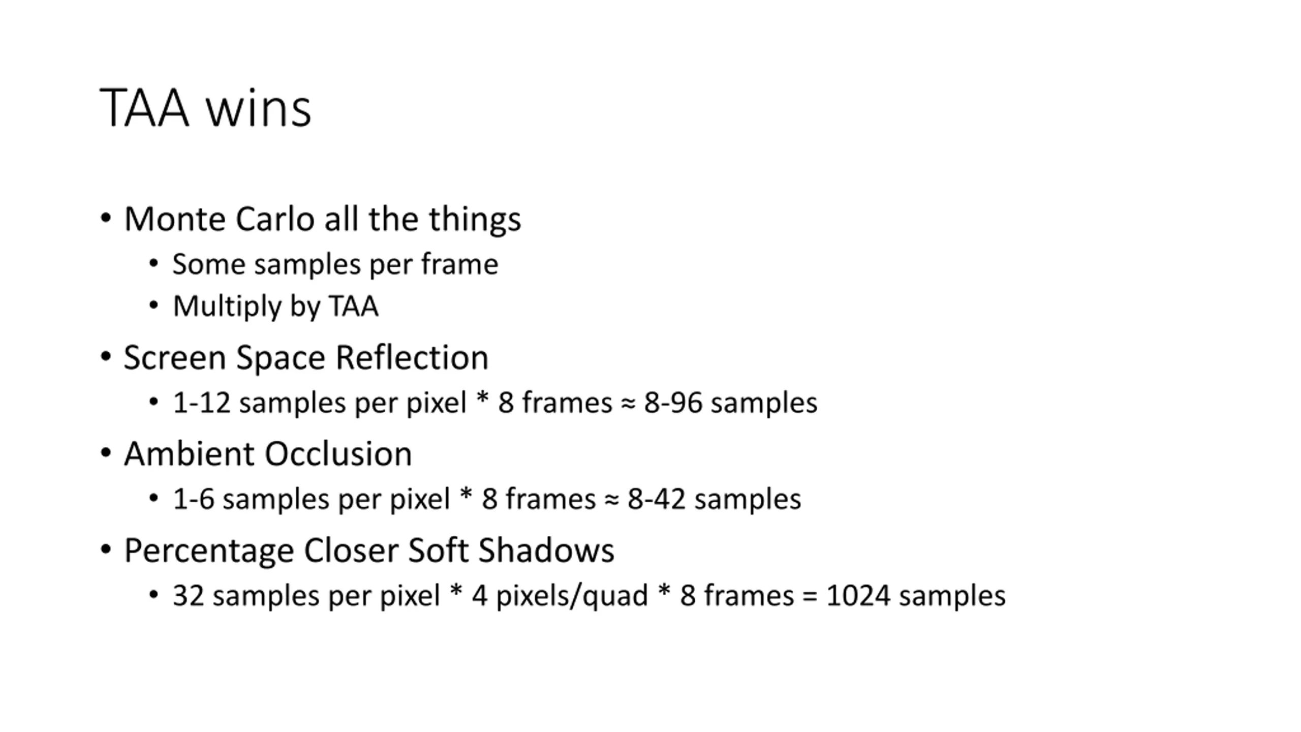 TAA wins Monte Carlo all the things Some samples per frame Multiply by TAA Screen Space Reflection 1-12 samples per pixel * 8 frames 8-96 samples Ambient Occlusion 1-6 samples per pixel * 8 frames 8-42 samples Percentage Closer Soft Shadows 32 samples per pixel * 4 pixels/quad * 8 frames = 1024 samples