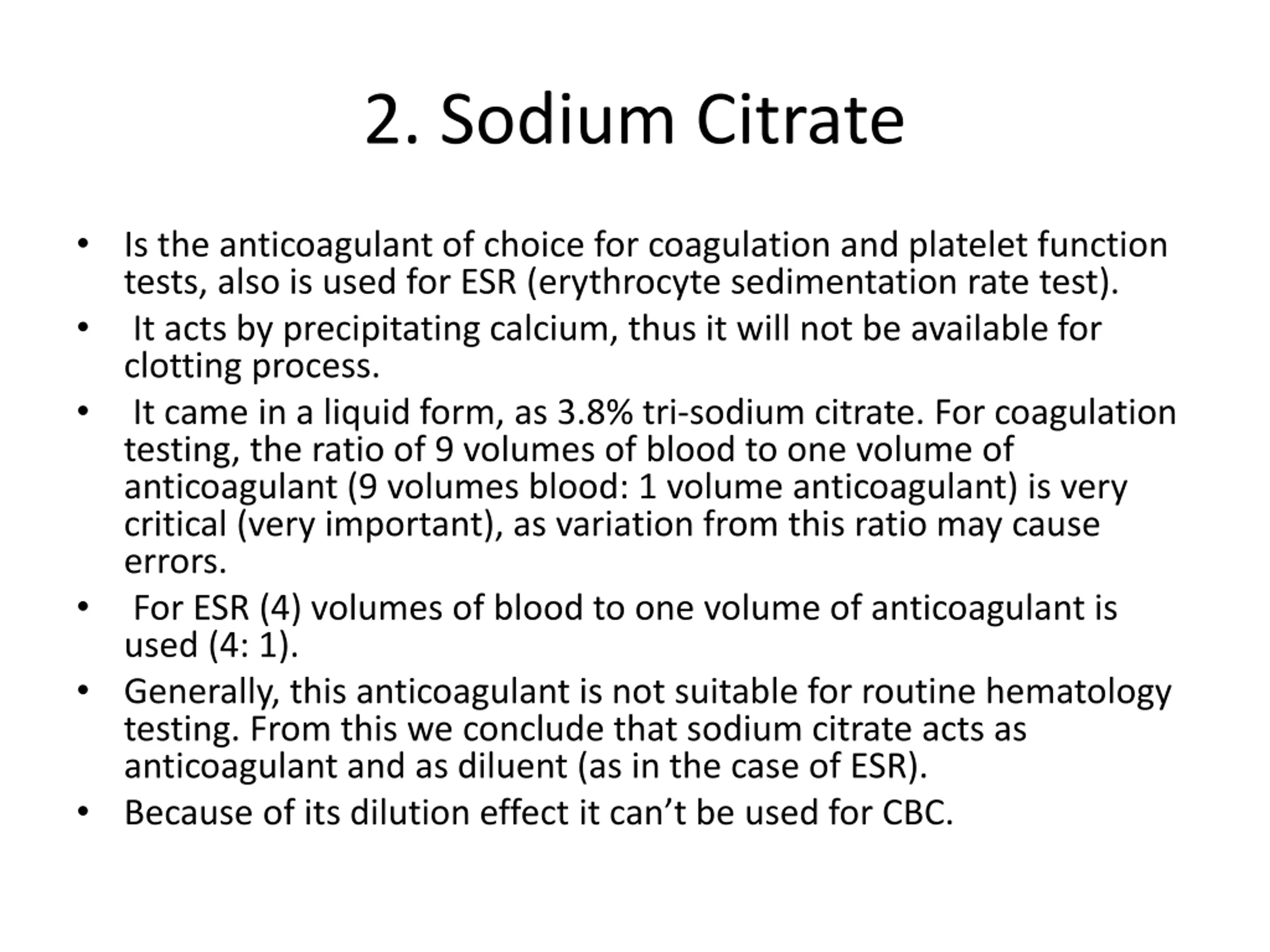 2. Sodium Citrate Is the anticoagulant of choice for coagulation and platelet function tests, also is used for ESR (erythrocyte sedimentation rate test). It acts by precipitating calcium, thus it will not be available for clotting process. It came in a liquid form, as 3.8% tri-sodium citrate. For coagulation testing, the ratio of 9 volumes of blood to one volume of anticoagulant (9 volumes blood: 1 volume anticoagulant) is very critical (very important), as variation from this ratio may cause errors. For ESR (4) volumes of blood to one volume of anticoagulant is used (4: 1). Generally, this anticoagulant is not suitable for routine hematology testing. From this we conclude that sodium citrate acts as anticoagulant and as diluent (as in the case of ESR). Because of its dilution effect it can t be used for CBC.