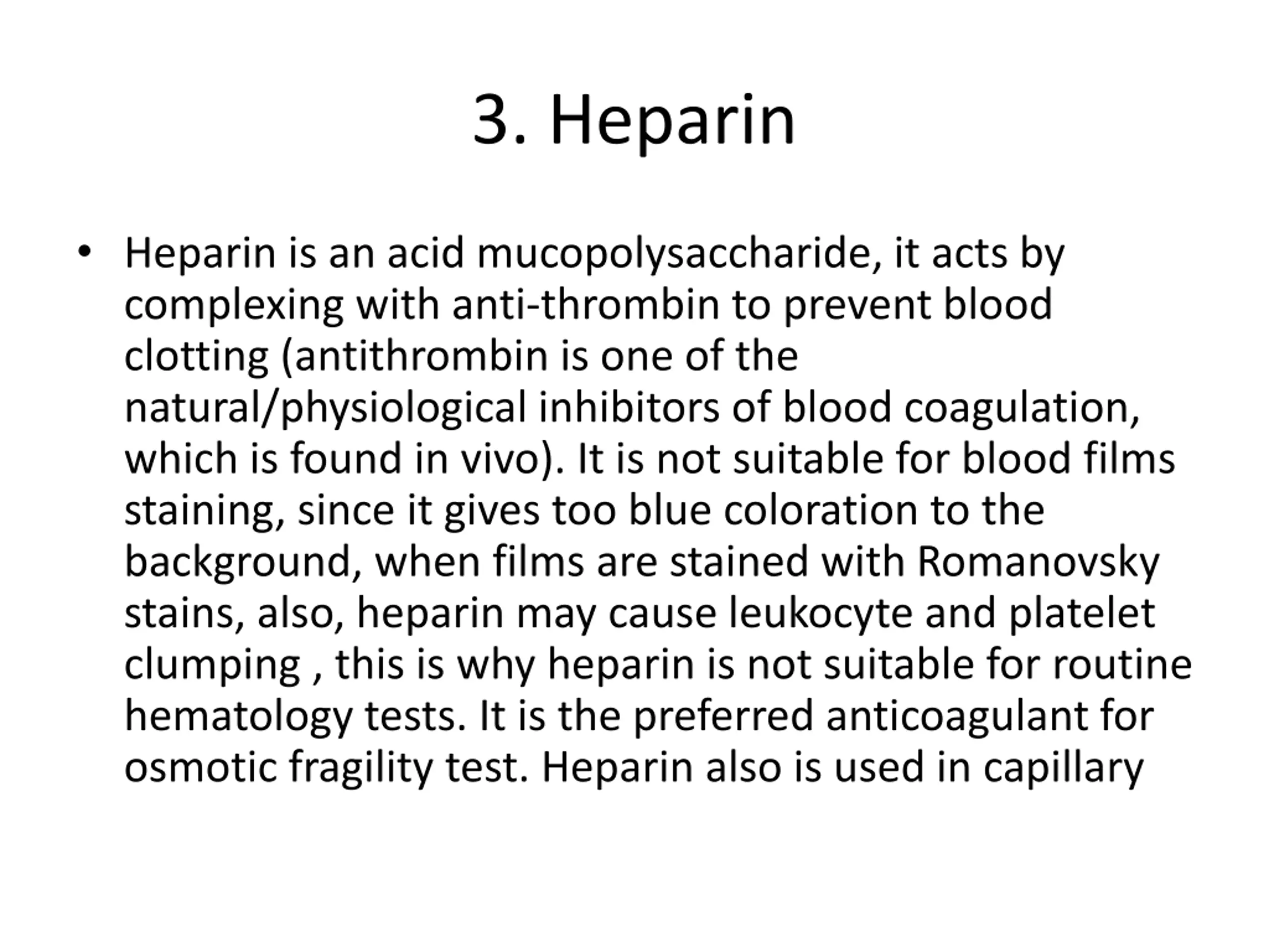 3. Heparin Heparin is an acid mucopolysaccharide, it acts by complexing with anti-thrombin to prevent blood clotting (antithrombin is one of the natural/physiological inhibitors of blood coagulation, which is found in vivo). It is not suitable for blood films staining, since it gives too blue coloration to the background, when films are stained with Romanovsky stains, also, heparin may cause leukocyte and platelet clumping , this is why heparin is not suitable for routine hematology tests. It is the preferred anticoagulant for osmotic fragility test. Heparin also is used in capillary