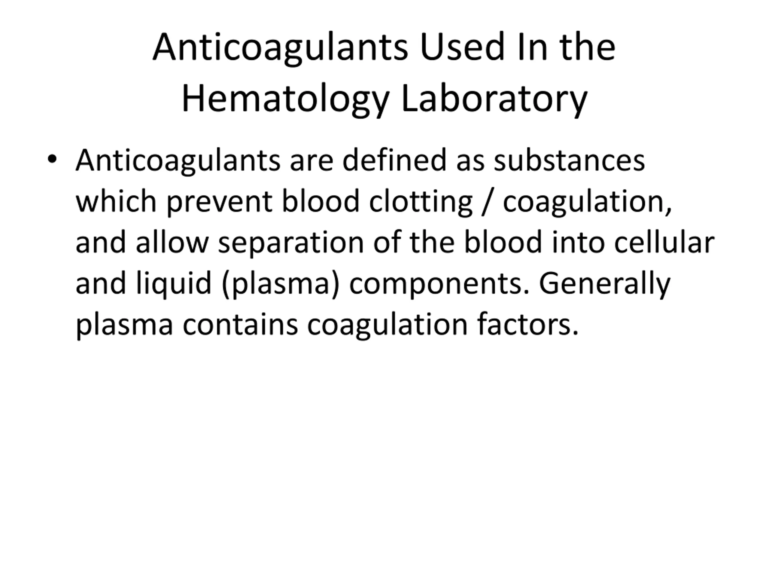Anticoagulants Used In the Hematology Laboratory Anticoagulants are defined as substances which prevent blood clotting / coagulation, and allow separation of the blood into cellular and liquid (plasma) components. Generally plasma contains coagulation factors.