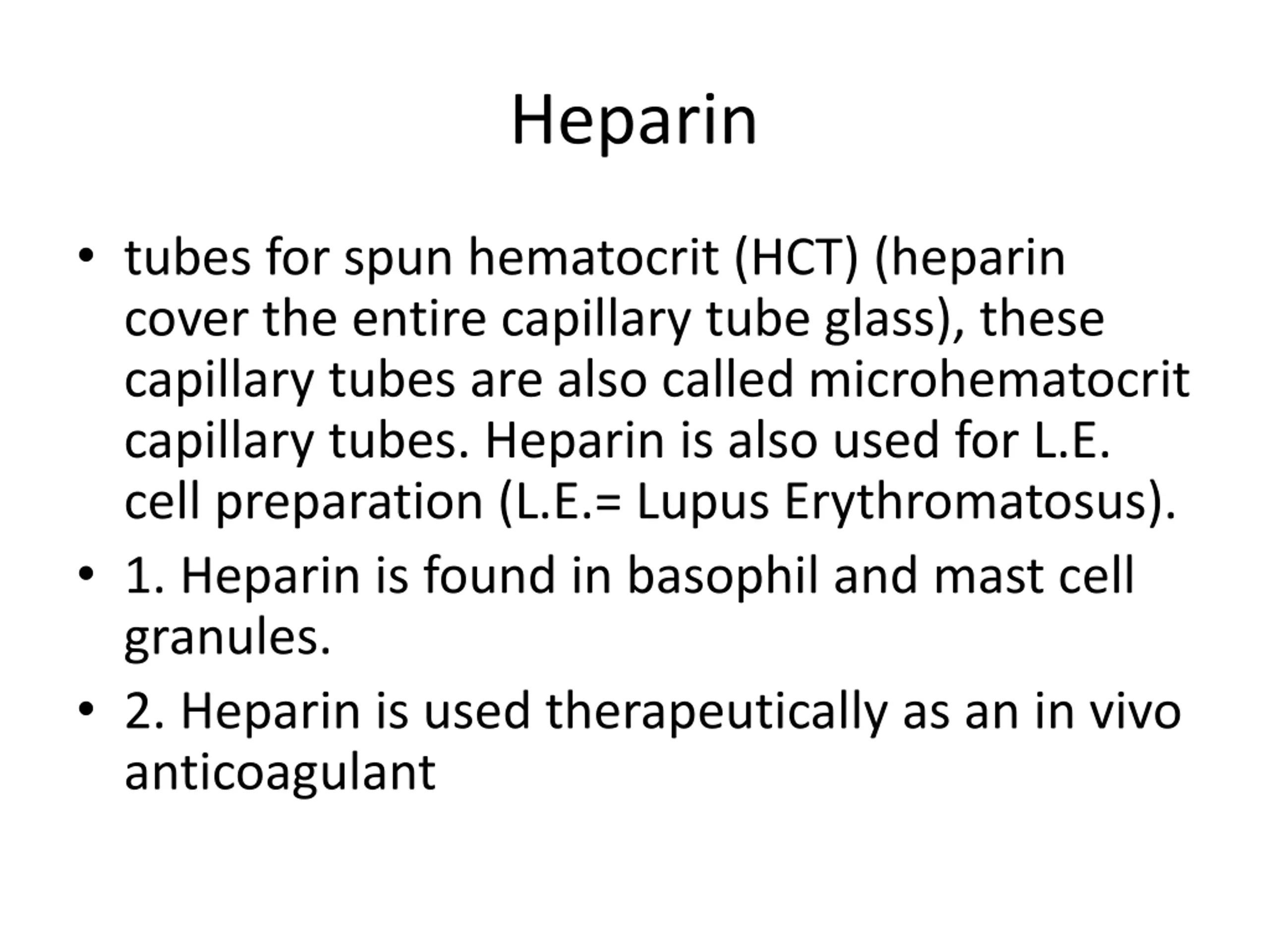 Heparin tubes for spun hematocrit (HCT) (heparin cover the entire capillary tube glass), these capillary tubes are also called microhematocrit capillary tubes. Heparin is also used for L.E. cell preparation (L.E.= Lupus Erythromatosus). 1. Heparin is found in basophil and mast cell granules. 2. Heparin is used therapeutically as an in vivo anticoagulant