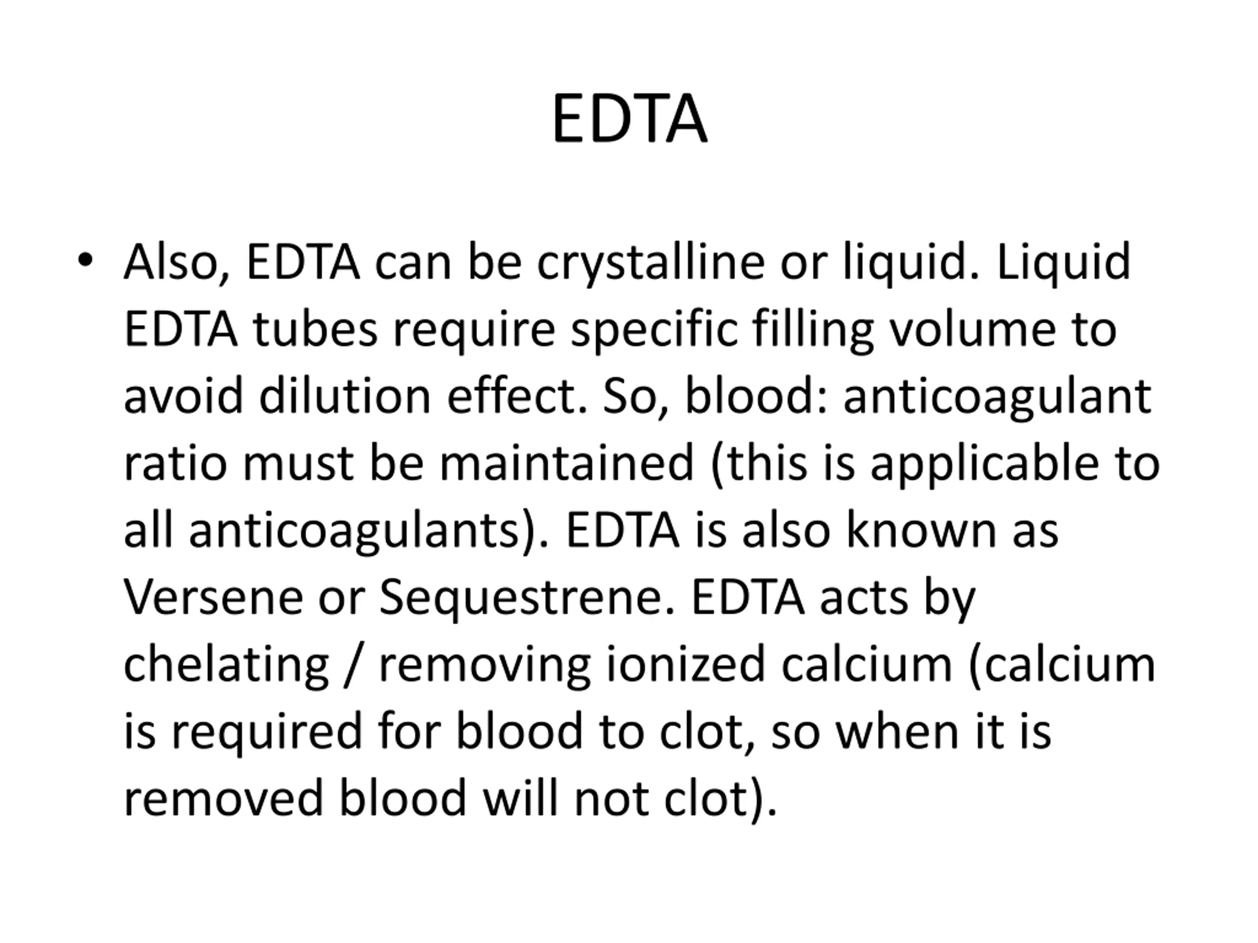 EDTA Also, EDTA can be crystalline or liquid. Liquid EDTA tubes require specific filling volume to avoid dilution effect. So, blood: anticoagulant ratio must be maintained (this is applicable to all anticoagulants). EDTA is also known as Versene or Sequestrene. EDTA acts by chelating / removing ionized calcium (calcium is required for blood to clot, so when it is removed blood will not clot).