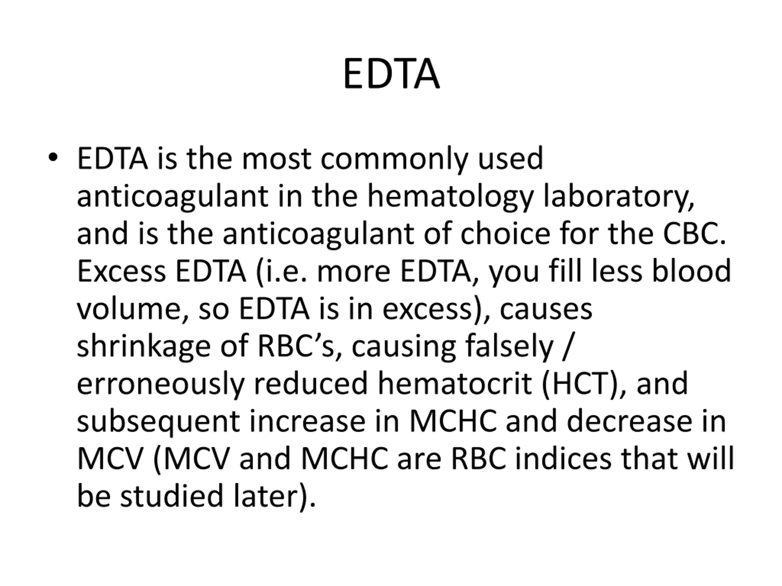 EDTA EDTA is the most commonly used anticoagulant in the hematology laboratory, and is the anticoagulant of choice for the CBC. Excess EDTA (i.e. more EDTA, you fill less blood volume, so EDTA is in excess), causes shrinkage of RBC s, causing falsely / erroneously reduced hematocrit (HCT), and subsequent increase in MCHC and decrease in MCV (MCV and MCHC are RBC indices that will be studied later).