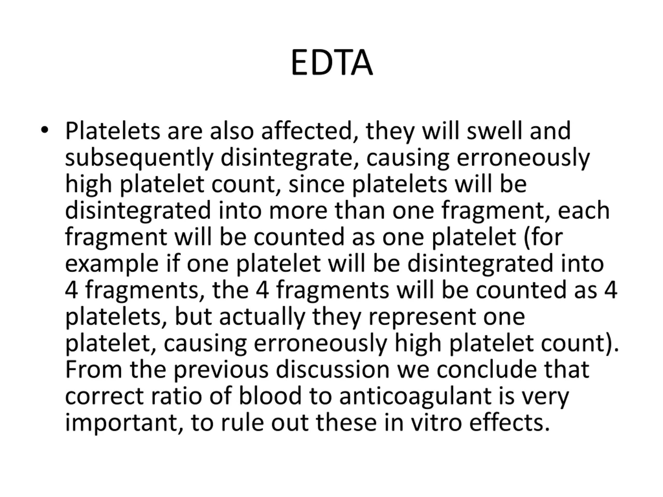 EDTA Platelets are also affected, they will swell and subsequently disintegrate, causing erroneously high platelet count, since platelets will be disintegrated into more than one fragment, each fragment will be counted as one platelet (for example if one platelet will be disintegrated into 4 fragments, the 4 fragments will be counted as 4 platelets, but actually they represent one platelet, causing erroneously high platelet count). From the previous discussion we conclude that correct ratio of blood to anticoagulant is very important, to rule out these in vitro effects.