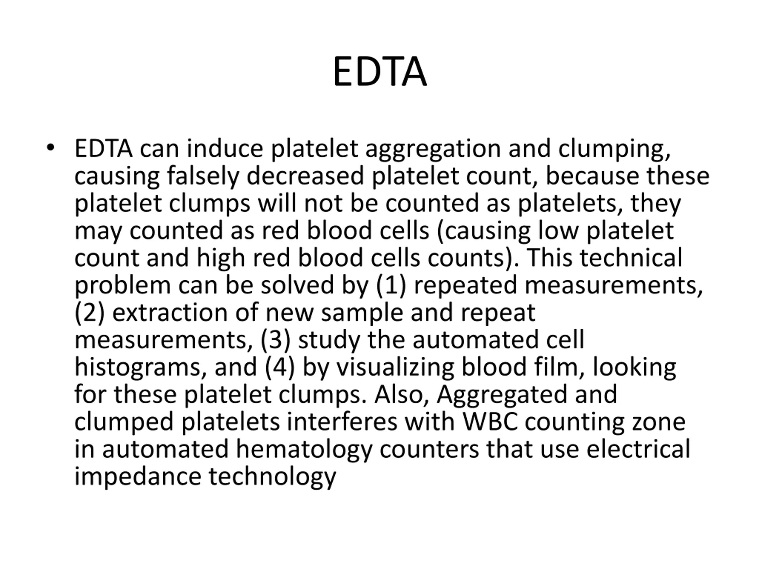 EDTA EDTA can induce platelet aggregation and clumping, causing falsely decreased platelet count, because these platelet clumps will not be counted as platelets, they may counted as red blood cells (causing low platelet count and high red blood cells counts). This technical problem can be solved by (1) repeated measurements, (2) extraction of new sample and repeat measurements, (3) study the automated cell histograms, and (4) by visualizing blood film, looking for these platelet clumps. Also, Aggregated and clumped platelets interferes with WBC counting zone in automated hematology counters that use electrical impedance technology