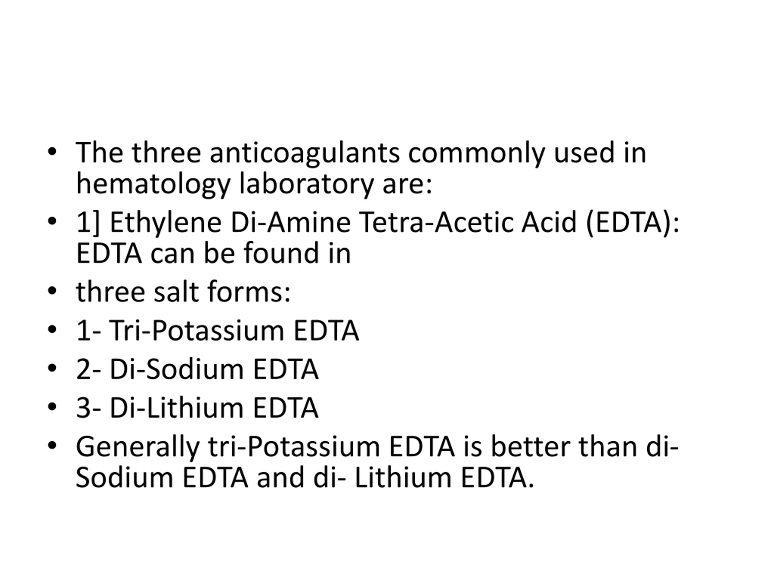 The three anticoagulants commonly used in hematology laboratory are: 1] Ethylene Di-Amine Tetra-Acetic Acid (EDTA): EDTA can be found in three salt forms: 1- Tri-Potassium EDTA 2- Di-Sodium EDTA 3- Di-Lithium EDTA Generally tri-Potassium EDTA is better than di- Sodium EDTA and di- Lithium EDTA.