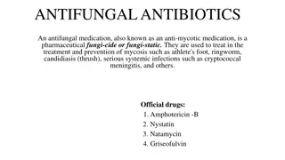 OH OH O OH HO O HO HO HO HO O Nystatin A Toxic, Topical(Local) treatment, CO2H O O NH2 OH Nystatin A OH Nystatin (originally named Fungicidin) is a polyene antifungal medication that is derived from a bacterium, Streptomyces noursei. Many mold and yeast infections are sensitive to nystatin, most notably Candida. It is used primarily for infections involving the skin, mouth, oesophagus, and vagina 7