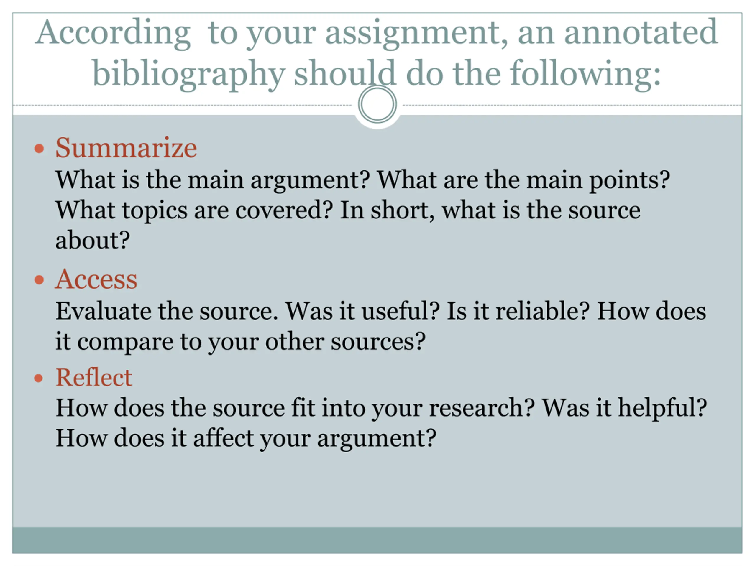 According to your assignment, an annotated bibliography should do the following: Summarize What is the main argument? What are the main points? What topics are covered? In short, what is the source about? Access Evaluate the source. Was it useful? Is it reliable? How does it compare to your other sources? Reflect How does the source fit into your research? Was it helpful? How does it affect your argument?