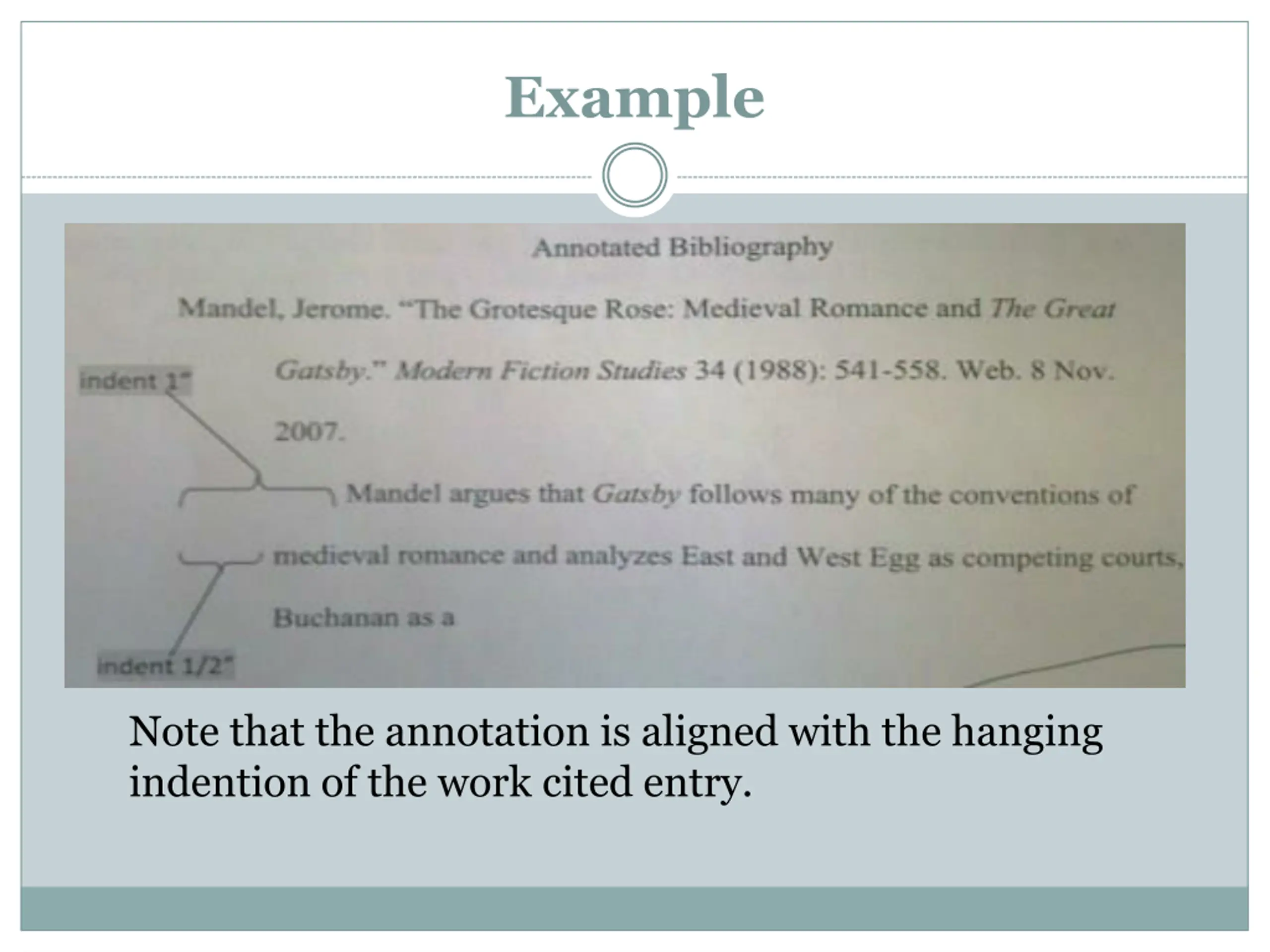 Example Note that the annotation is aligned with the hanging indention of the work cited entry.