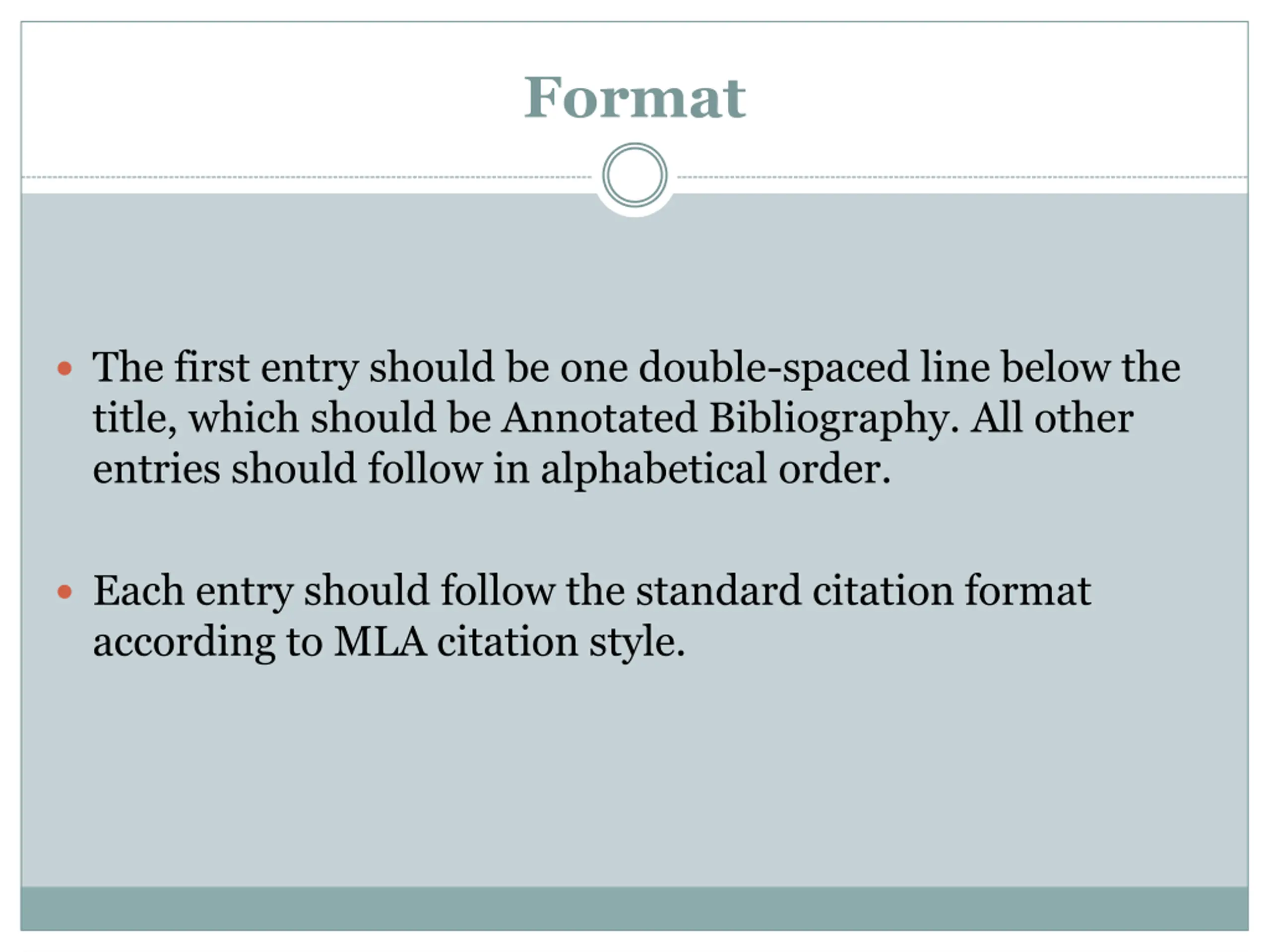 Format The first entry should be one double-spaced line below the title, which should be Annotated Bibliography. All other entries should follow in alphabetical order. Each entry should follow the standard citation format according to MLA citation style.