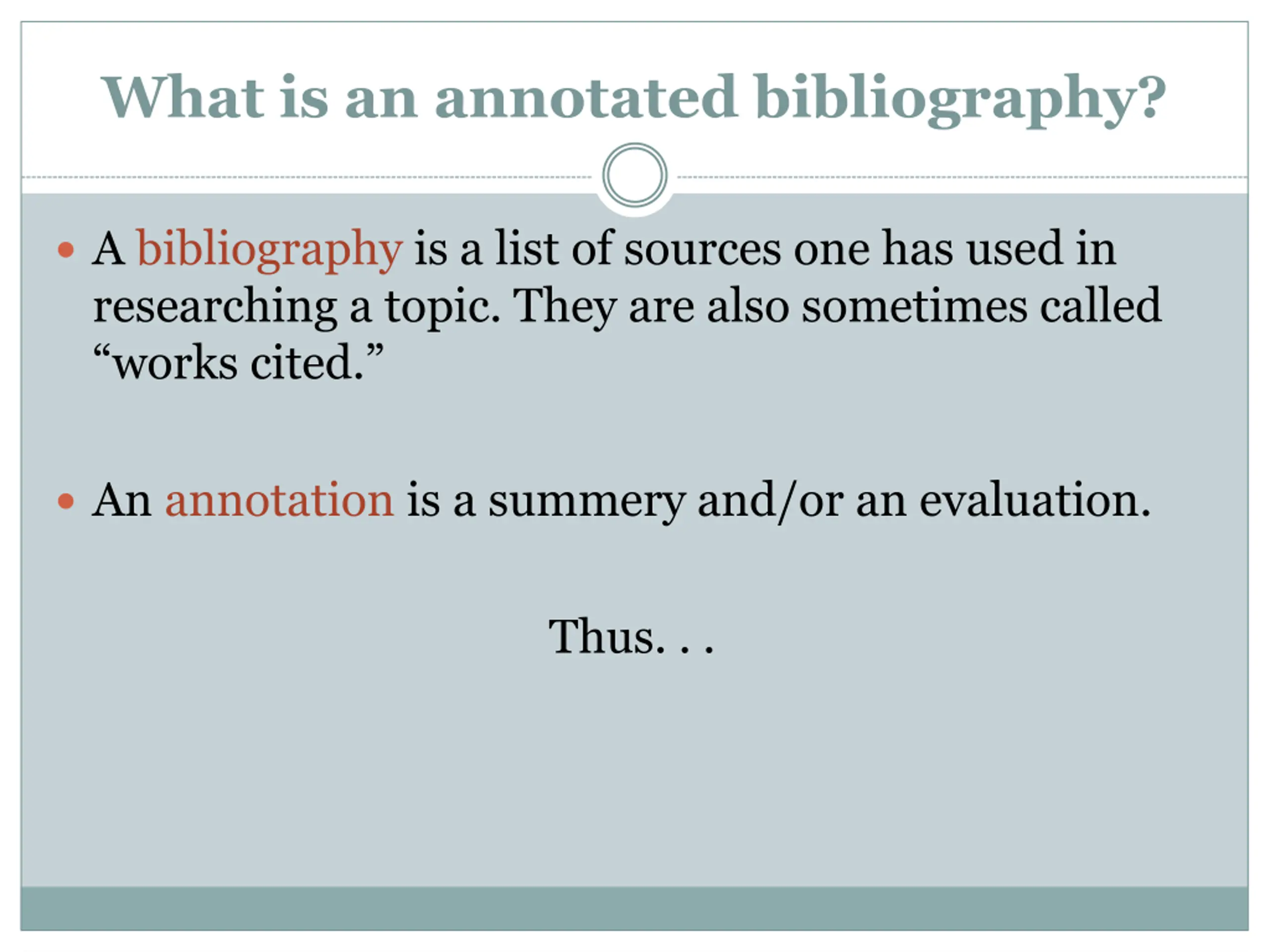 What is an annotated bibliography? A bibliography is a list of sources one has used in researching a topic. They are also sometimes called works cited. An annotation is a summery and/or an evaluation. Thus. . .