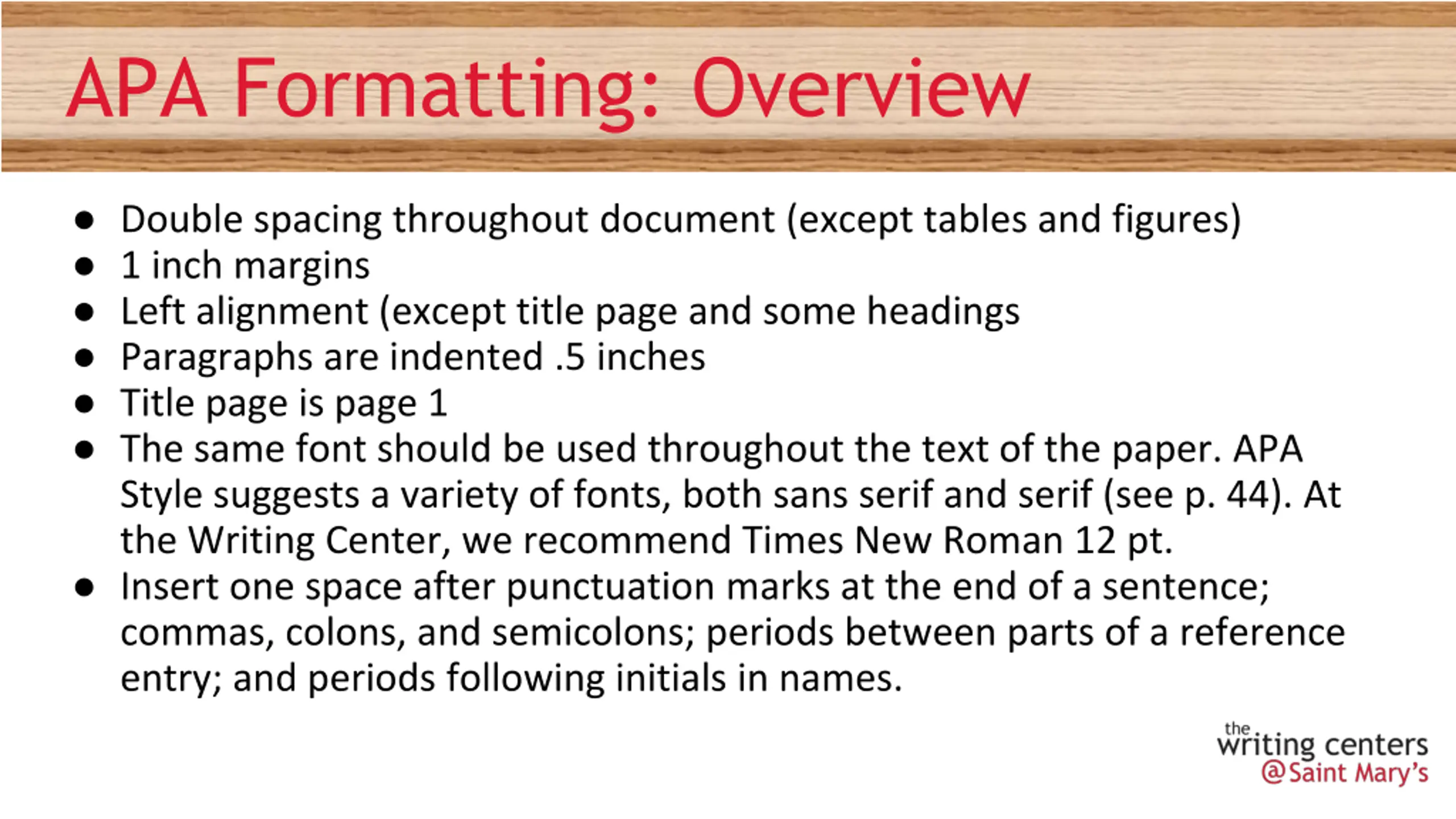 APA Formatting: Overview Double spacing throughout document (except tables and figures) 1 inch margins Left alignment (except title page and some headings Paragraphs are indented .5 inches Title page is page 1 The same font should be used throughout the text of the paper. APA Style suggests a variety of fonts, both sans serif and serif (see p. 44). At the Writing Center, we recommend Times New Roman 12 pt. Insert one space after punctuation marks at the end of a sentence; commas, colons, and semicolons; periods between parts of a reference entry; and periods following initials in names.