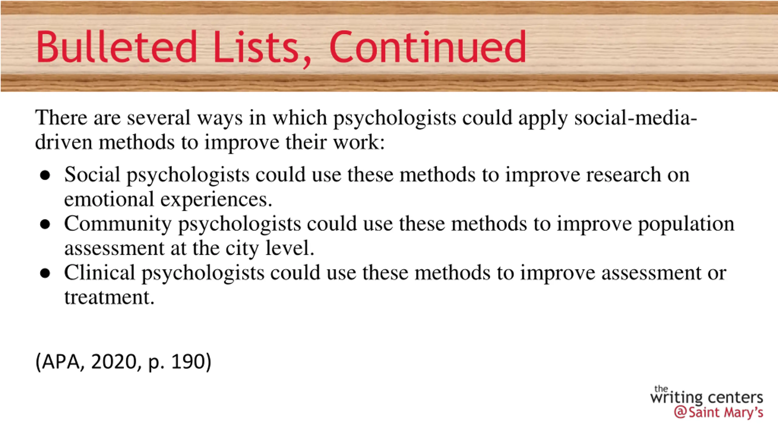 Bulleted Lists, Continued There are several ways in which psychologists could apply social-media- driven methods to improve their work: Social psychologists could use these methods to improve research on emotional experiences. Community psychologists could use these methods to improve population assessment at the city level. Clinical psychologists could use these methods to improve assessment or treatment. (APA, 2020, p. 190)