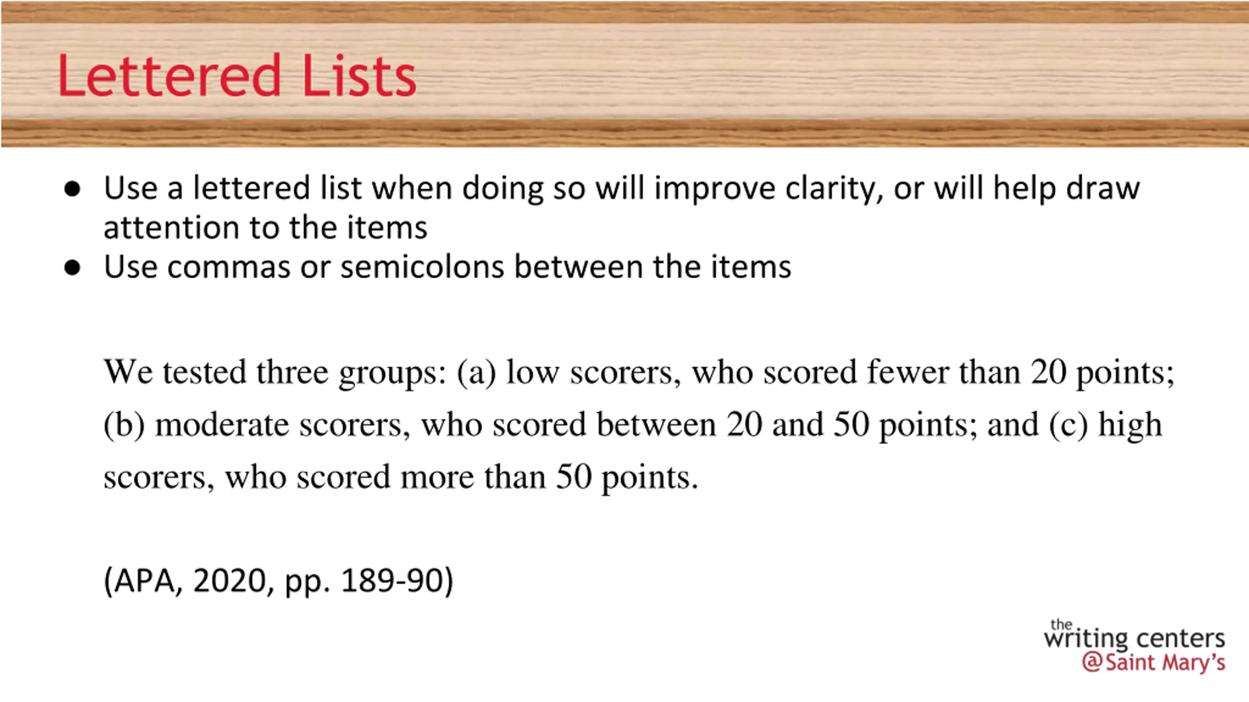 Lettered Lists Use a lettered list when doing so will improve clarity, or will help draw attention to the items Use commas or semicolons between the items We tested three groups: (a) low scorers, who scored fewer than 20 points; (b) moderate scorers, who scored between 20 and 50 points; and (c) high scorers, who scored more than 50 points. (APA, 2020, pp. 189-90)