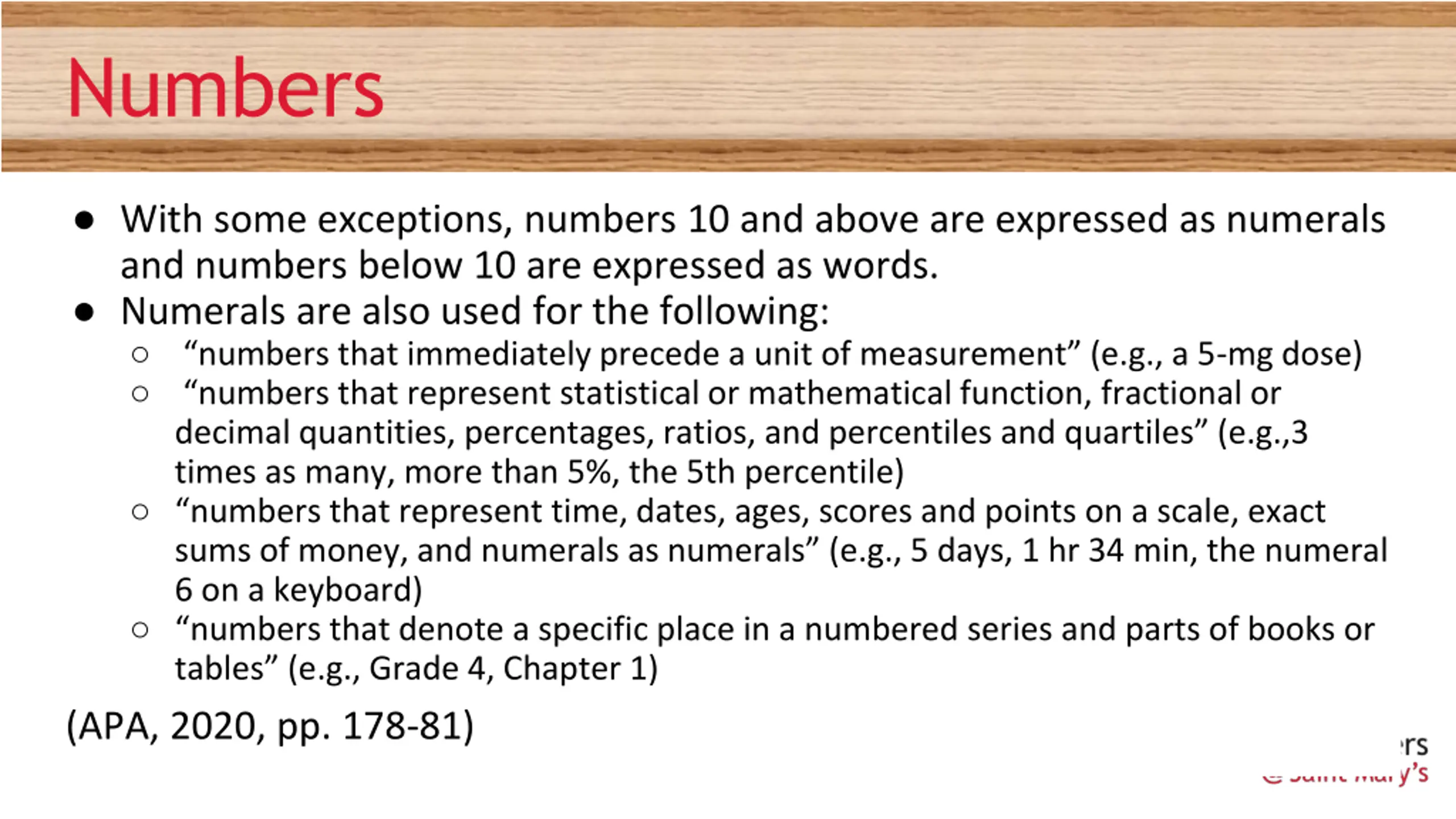 Numbers With some exceptions, numbers 10 and above are expressed as numerals and numbers below 10 are expressed as words. Numerals are also used for the following: numbers that immediately precede a unit of measurement (e.g., a 5-mg dose) numbers that represent statistical or mathematical function, fractional or decimal quantities, percentages, ratios, and percentiles and quartiles (e.g.,3 times as many, more than 5%, the 5th percentile) numbers that represent time, dates, ages, scores and points on a scale, exact sums of money, and numerals as numerals (e.g., 5 days, 1 hr 34 min, the numeral 6 on a keyboard) numbers that denote a specific place in a numbered series and parts of books or tables (e.g., Grade 4, Chapter 1) (APA, 2020, pp. 178-81)