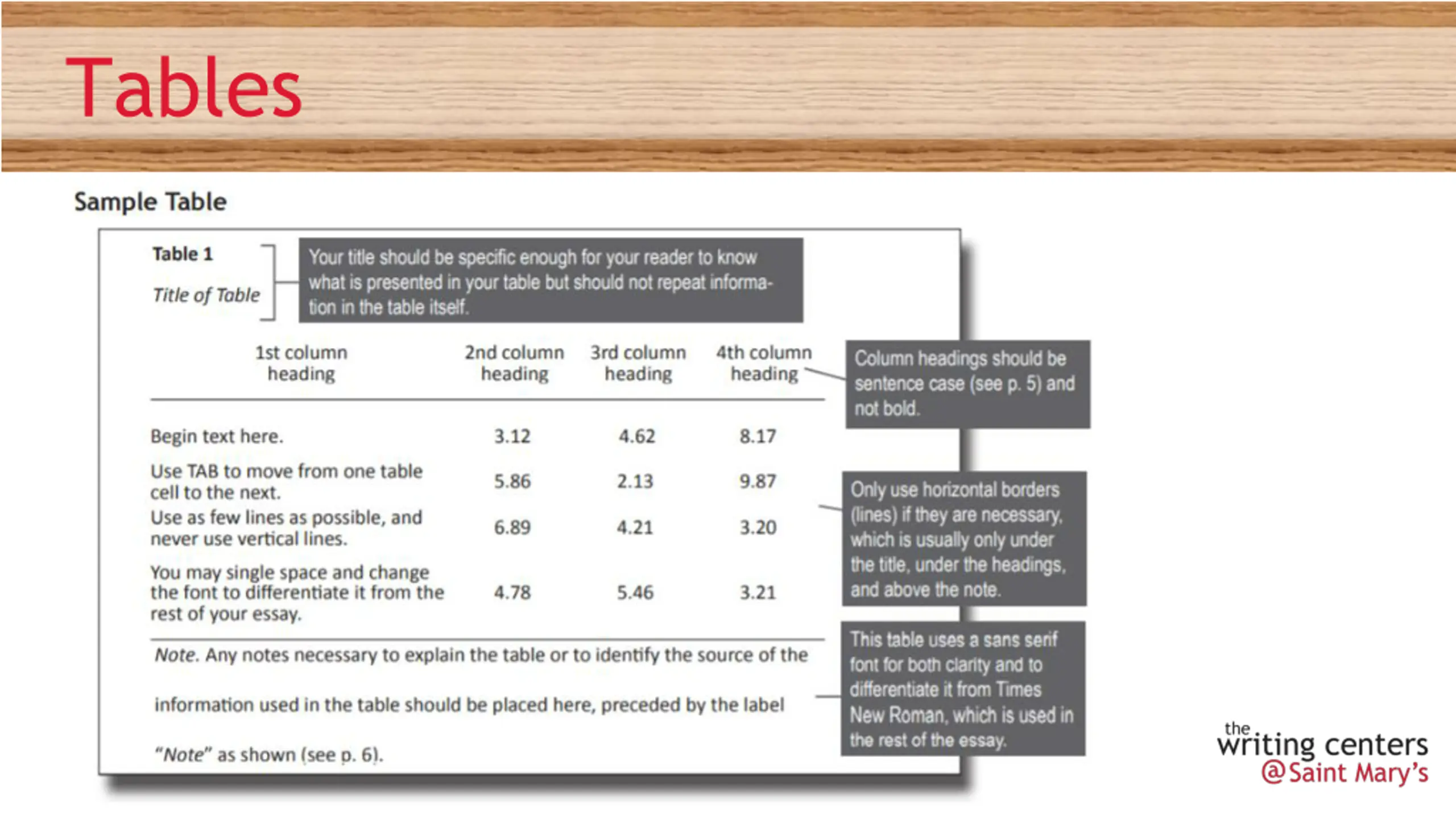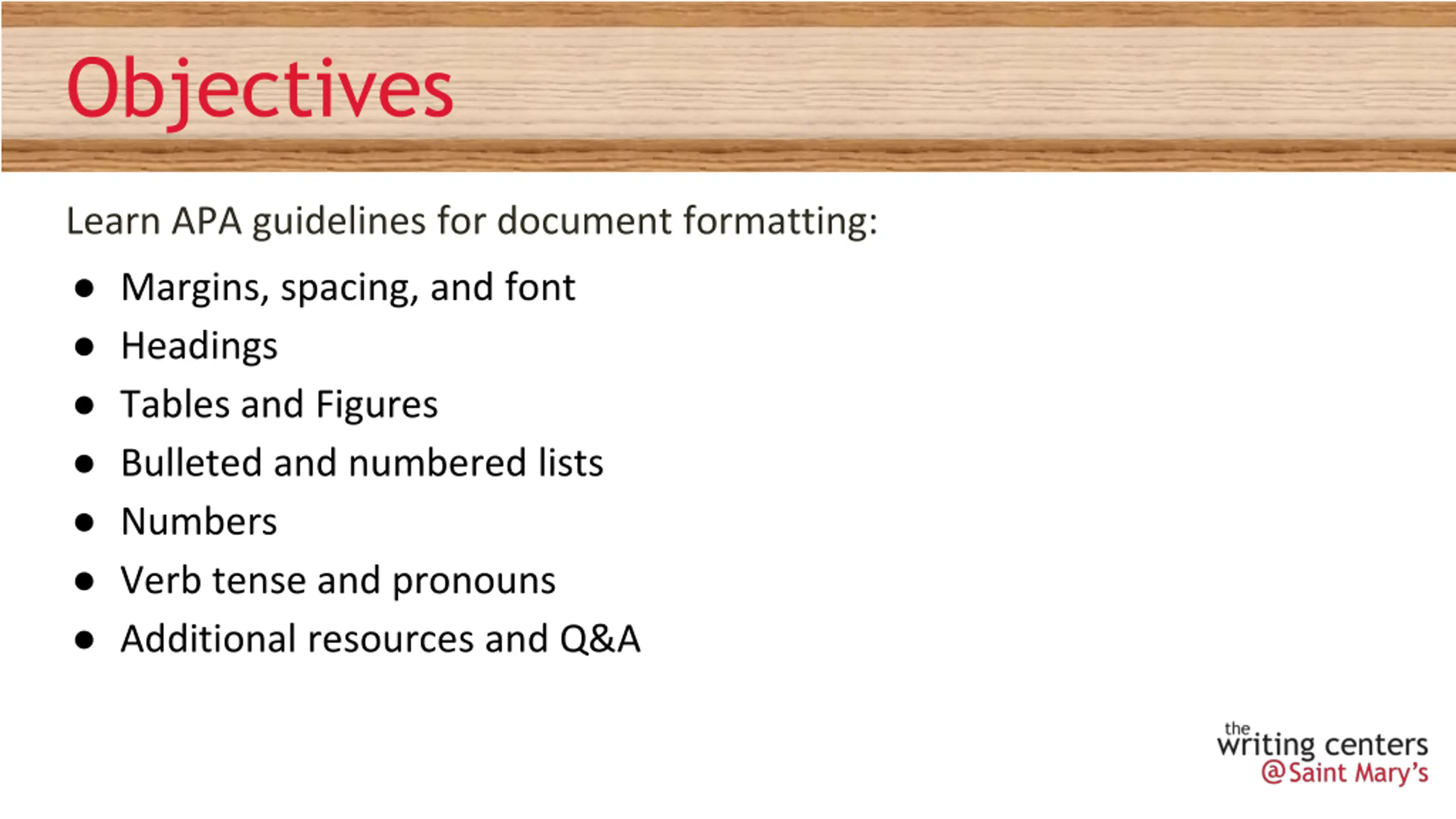Objectives Learn APA guidelines for document formatting: Margins, spacing, and font Headings Tables and Figures Bulleted and numbered lists Numbers Verb tense and pronouns Additional resources and Q&A