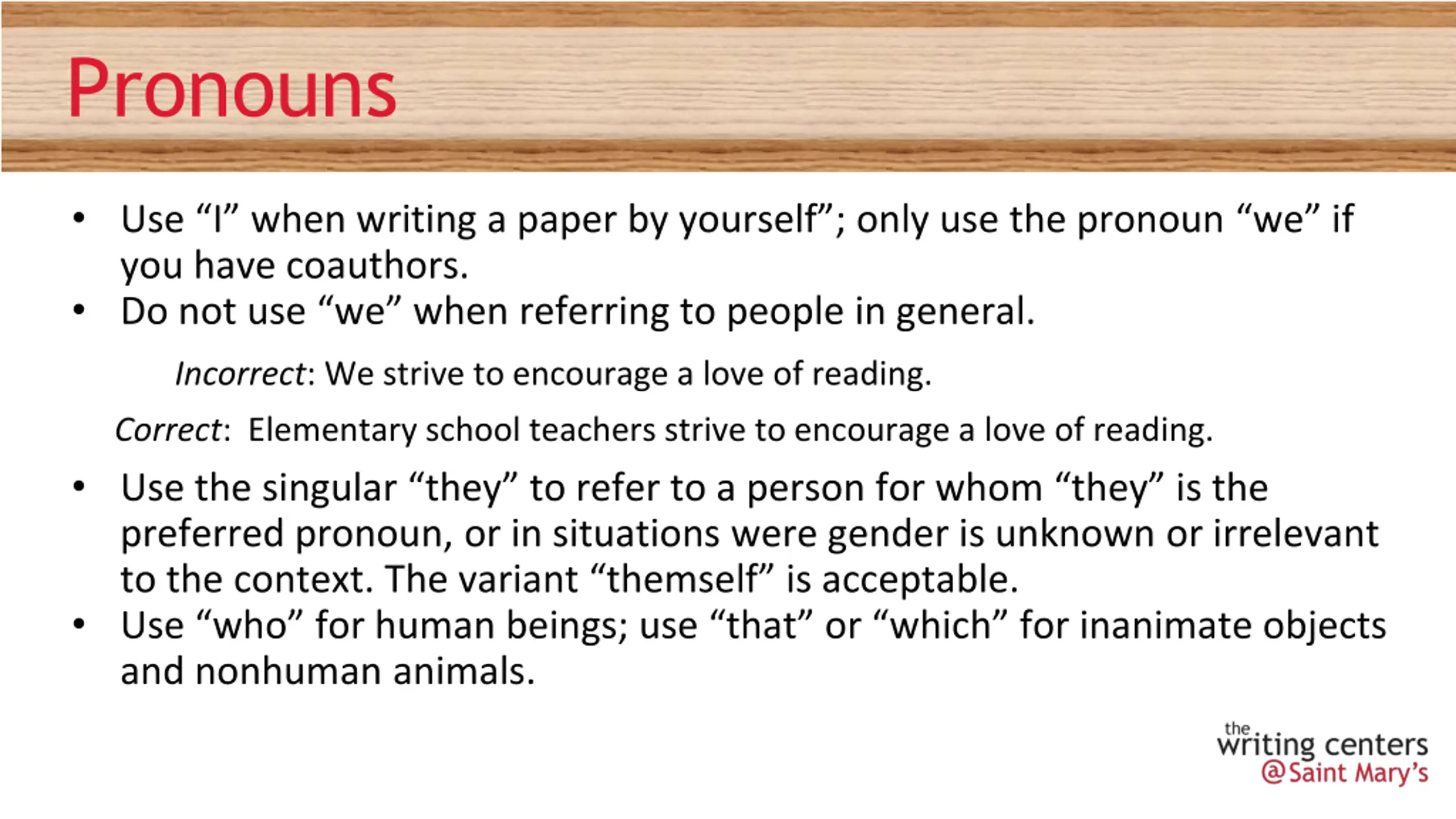 Pronouns Use I when writing a paper by yourself ; only use the pronoun we if you have coauthors. Do not use we when referring to people in general. Incorrect: We strive to encourage a love of reading. Correct: Elementary school teachers strive to encourage a love of reading. Use the singular they to refer to a person for whom they is the preferred pronoun, or in situations were gender is unknown or irrelevant to the context. The variant themself is acceptable. Use who for human beings; use that or which for inanimate objects and nonhuman animals.