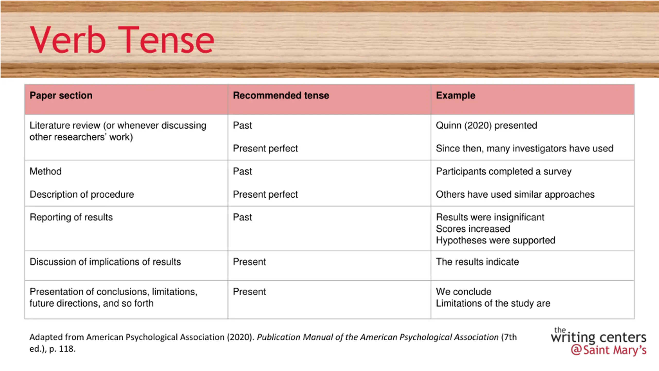 Verb Tense Paper section Recommended tense Example Literature review (or whenever discussing other researchers work) Past Quinn (2020) presented Present perfect Since then, many investigators have used Method Past Participants completed a survey Description of procedure Present perfect Others have used similar approaches Reporting of results Past Results were insignificant Scores increased Hypotheses were supported Discussion of implications of results Present The results indicate Presentation of conclusions, limitations, future directions, and so forth Present We conclude Limitations of the study are Adapted from American Psychological Association (2020). Publication Manual of the American Psychological Association (7th ed.), p. 118.