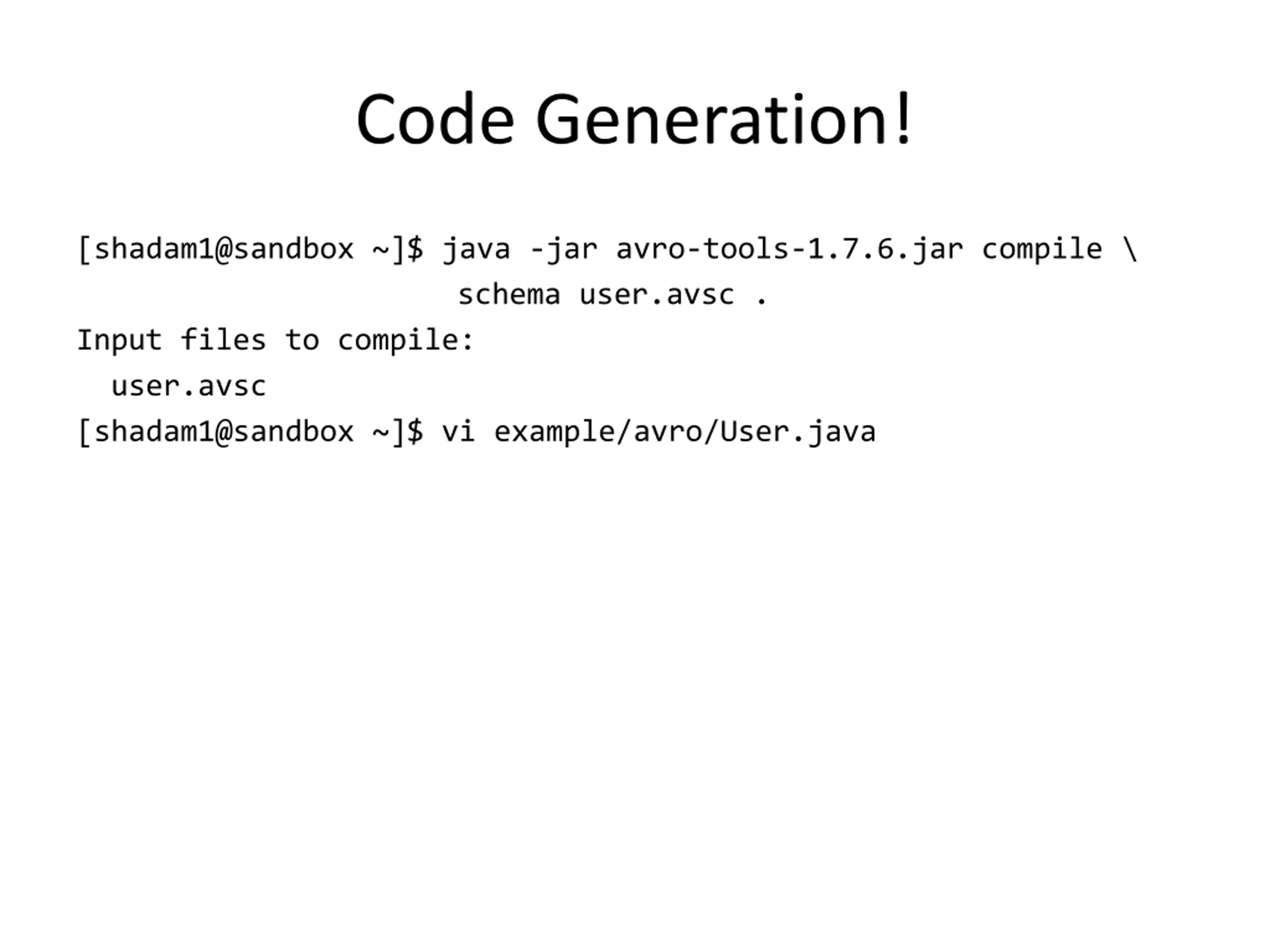 Code Generation! [shadam1@sandbox ~]$ java -jar avro-tools-1.7.6.jar compile \ schema user.avsc . Input files to compile: user.avsc [shadam1@sandbox ~]$ vi example/avro/User.java