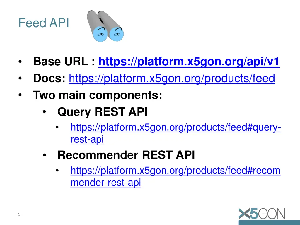 API Overview X5GON currently supports 2 main APIs: 1. Feed API: The set of endpoints that will allow browsing and accessing meta-information about the OER materials feed. 2. Learning Analytics Machine (LAM API): The set of API endpoints that provide AI features extracted from the OER materials 4
