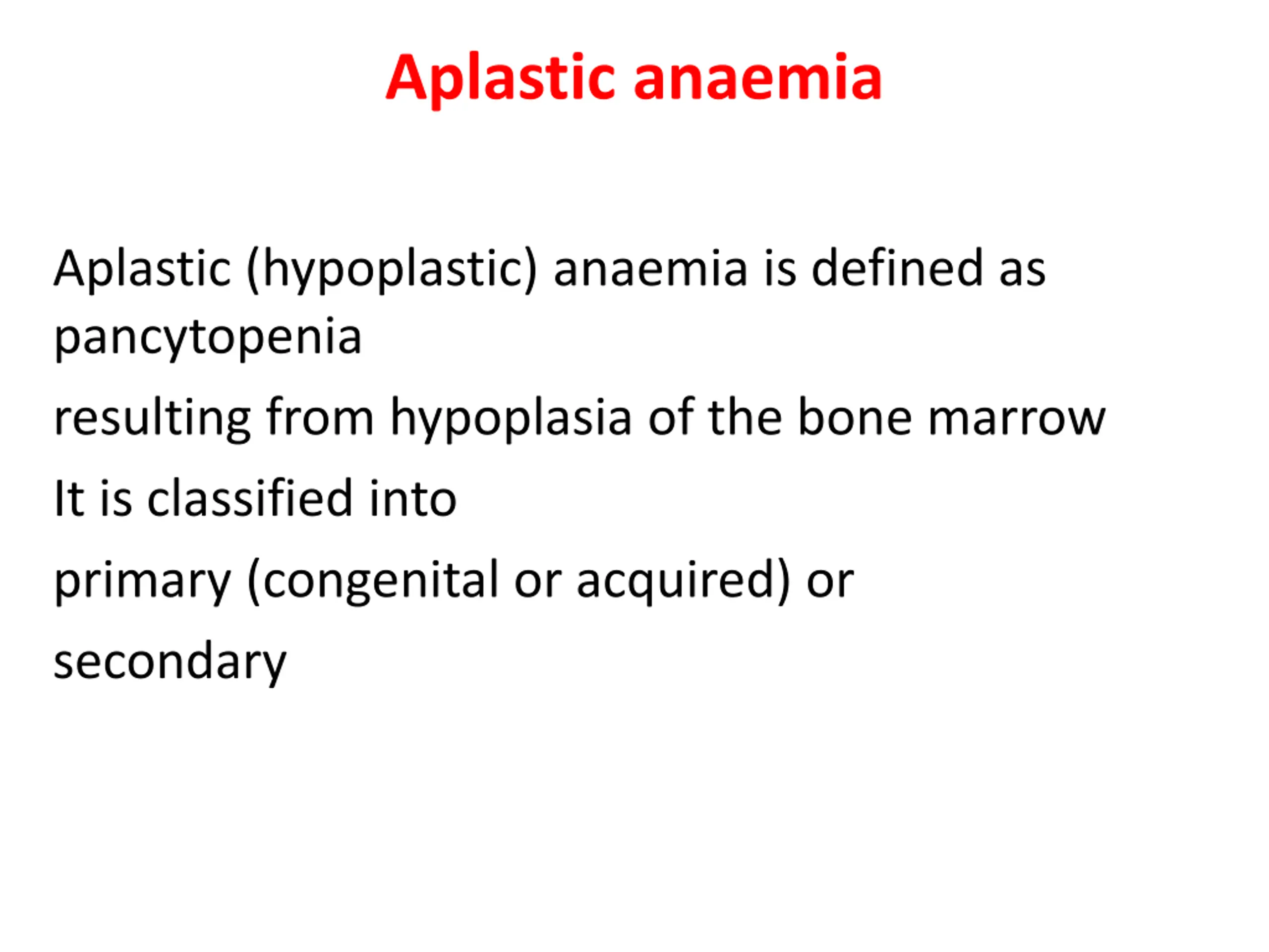 Aplastic anaemia Aplastic (hypoplastic) anaemia is defined as pancytopenia resulting from hypoplasia of the bone marrow It is classified into primary (congenital or acquired) or secondary