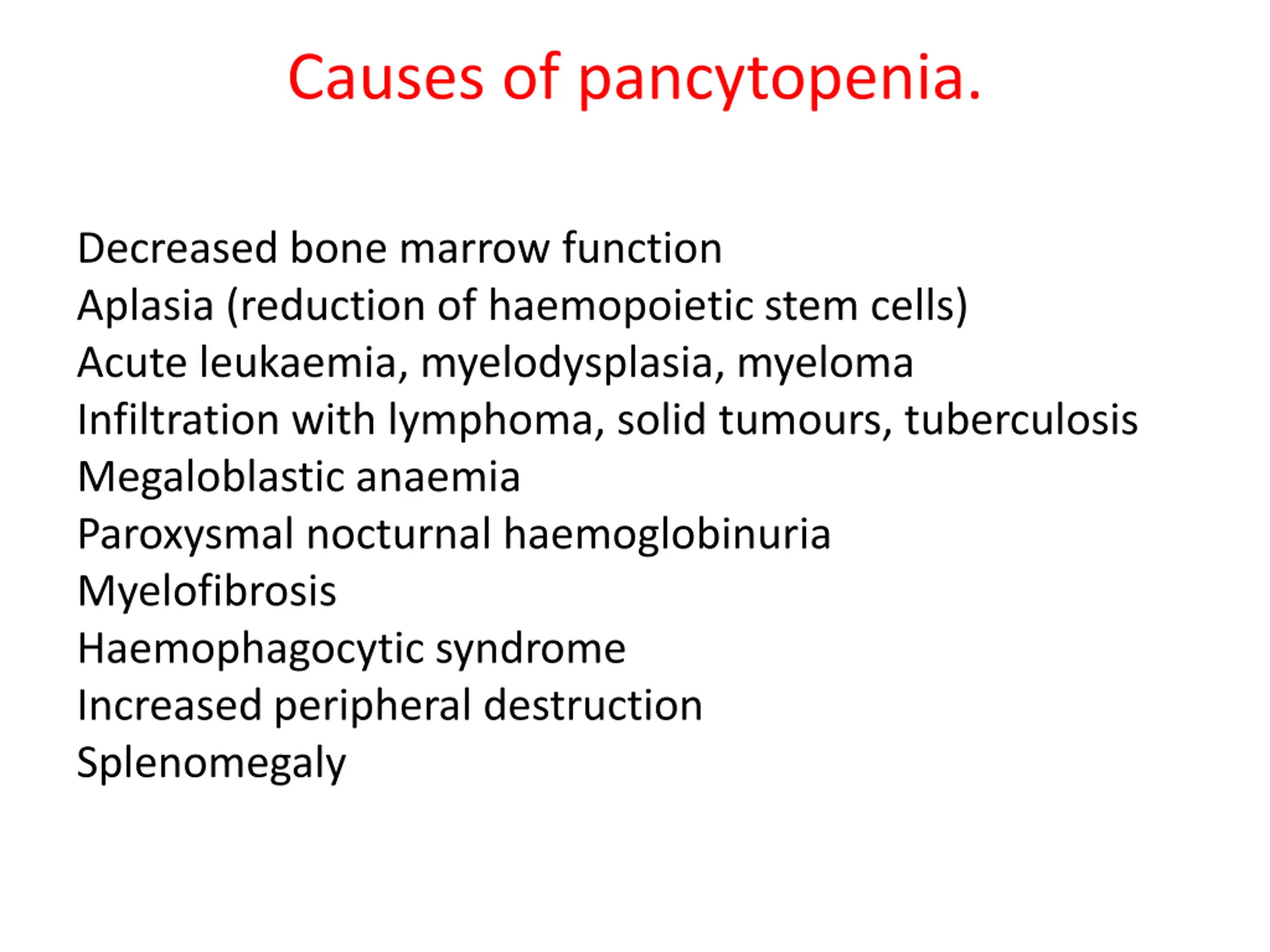 Causes of pancytopenia. Decreased bone marrow function Aplasia (reduction of haemopoietic stem cells) Acute leukaemia, myelodysplasia, myeloma Infiltration with lymphoma, solid tumours, tuberculosis Megaloblastic anaemia Paroxysmal nocturnal haemoglobinuria Myelofibrosis Haemophagocytic syndrome Increased peripheral destruction Splenomegaly