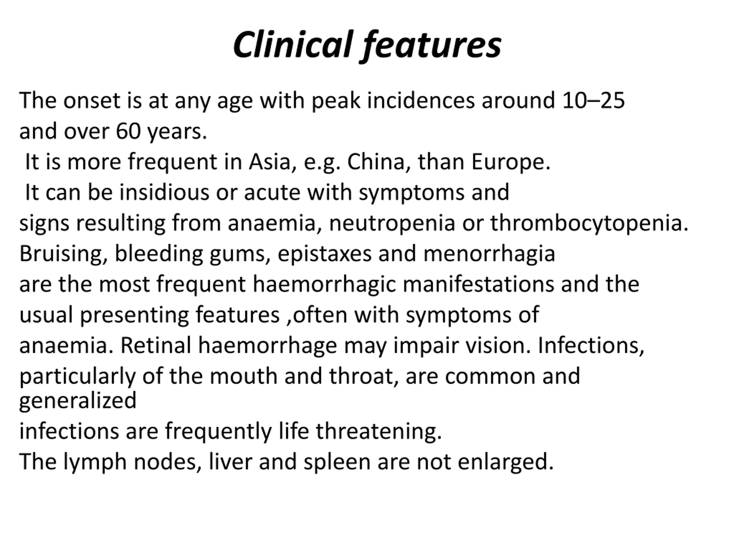Clinical features The onset is at any age with peak incidences around 10 25 and over 60 years. It is more frequent in Asia, e.g. China, than Europe. It can be insidious or acute with symptoms and signs resulting from anaemia, neutropenia or thrombocytopenia. Bruising, bleeding gums, epistaxes and menorrhagia are the most frequent haemorrhagic manifestations and the usual presenting features ,often with symptoms of anaemia. Retinal haemorrhage may impair vision. Infections, particularly of the mouth and throat, are common and generalized infections are frequently life threatening. The lymph nodes, liver and spleen are not enlarged.