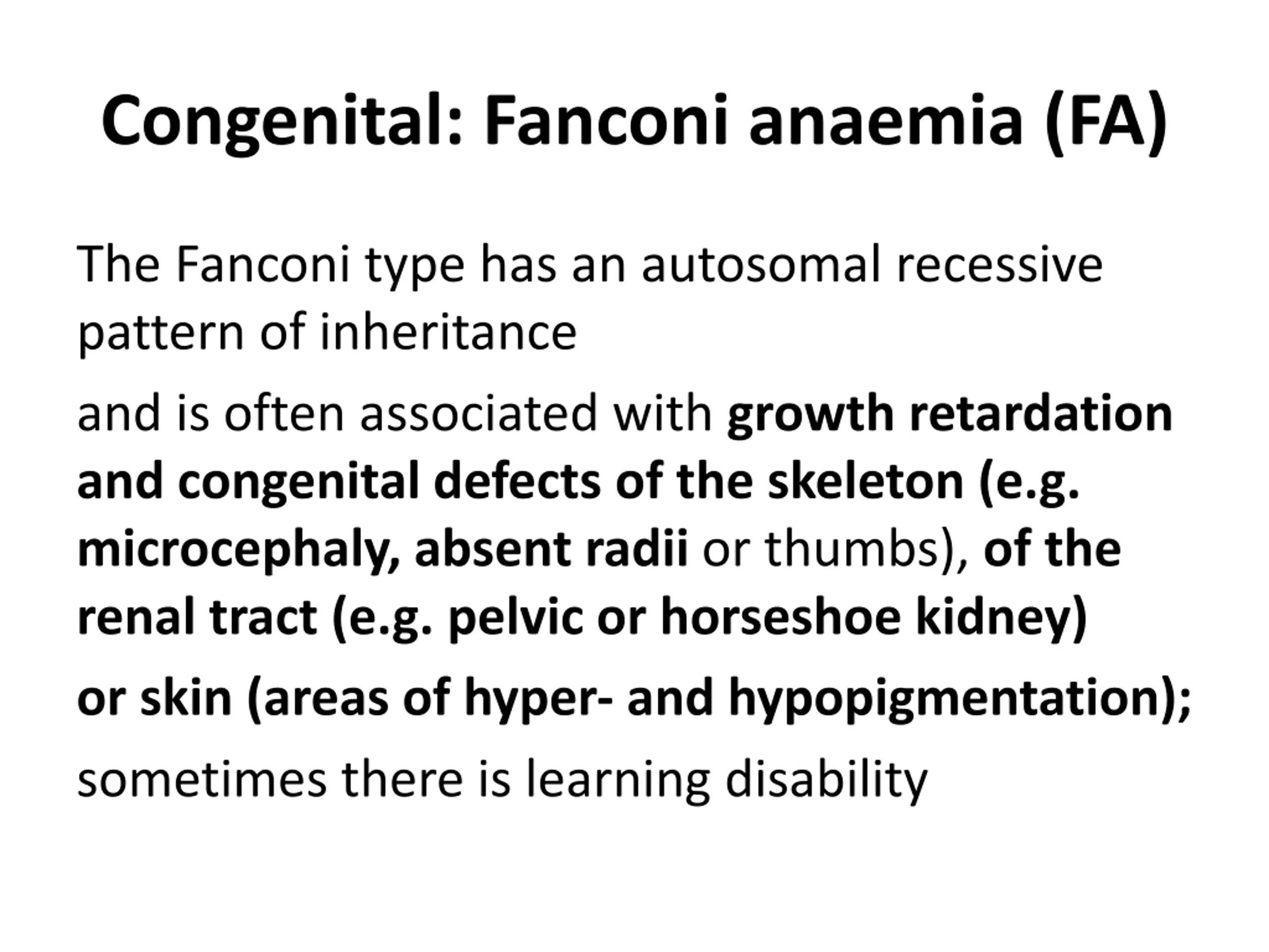 Congenital: Fanconi anaemia (FA) The Fanconi type has an autosomal recessive pattern of inheritance and is often associated with growth retardation and congenital defects of the skeleton (e.g. microcephaly, absent radii or thumbs), of the renal tract (e.g. pelvic or horseshoe kidney) or skin (areas of hyper and hypopigmentation); sometimes there is learning disability