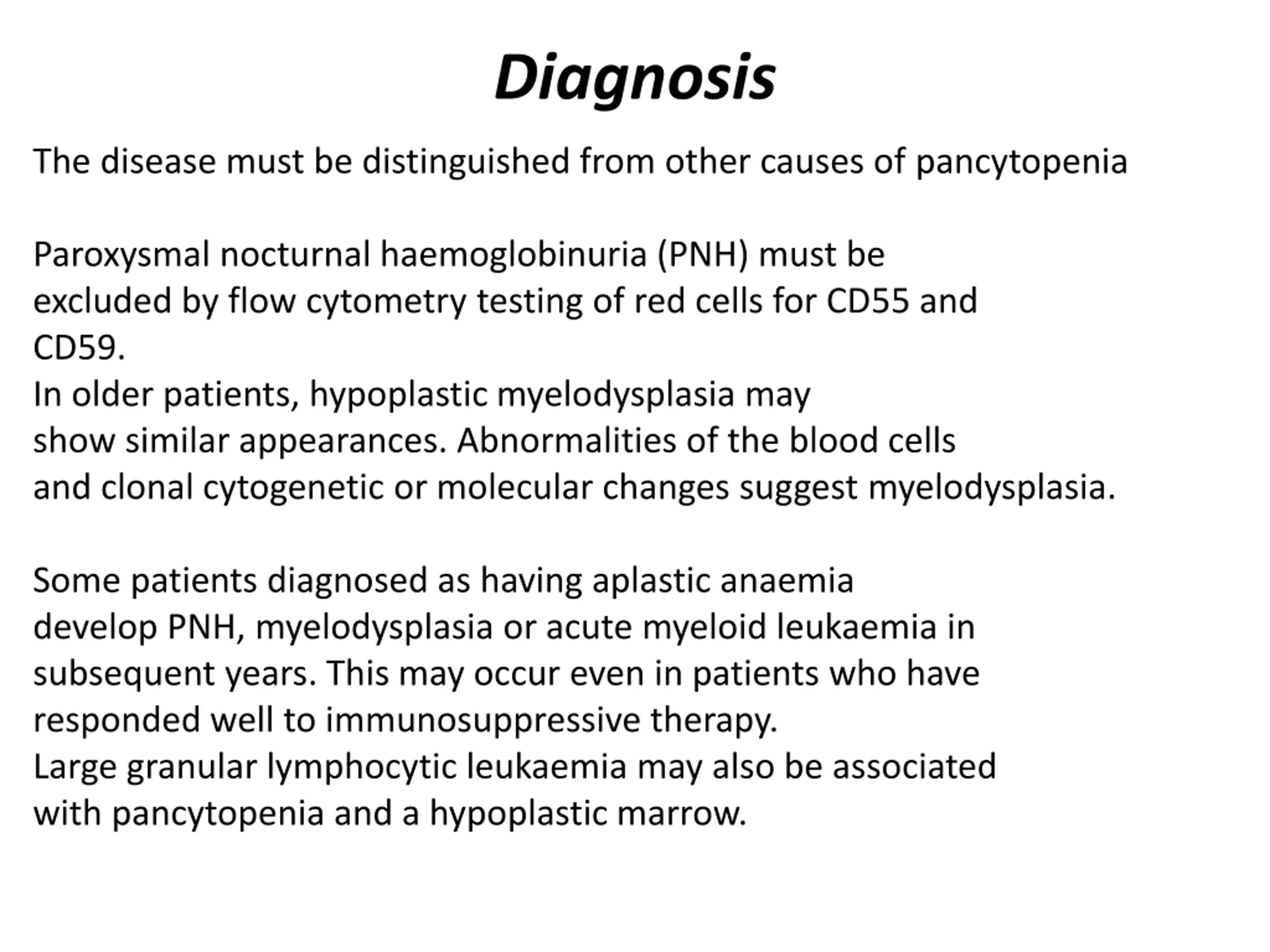 Diagnosis The disease must be distinguished from other causes of pancytopenia Paroxysmal nocturnal haemoglobinuria (PNH) must be excluded by flow cytometry testing of red cells for CD55 and CD59. In older patients, hypoplastic myelodysplasia may show similar appearances. Abnormalities of the blood cells and clonal cytogenetic or molecular changes suggest myelodysplasia. Some patients diagnosed as having aplastic anaemia develop PNH, myelodysplasia or acute myeloid leukaemia in subsequent years. This may occur even in patients who have responded well to immunosuppressive therapy. Large granular lymphocytic leukaemia may also be associated with pancytopenia and a hypoplastic marrow.