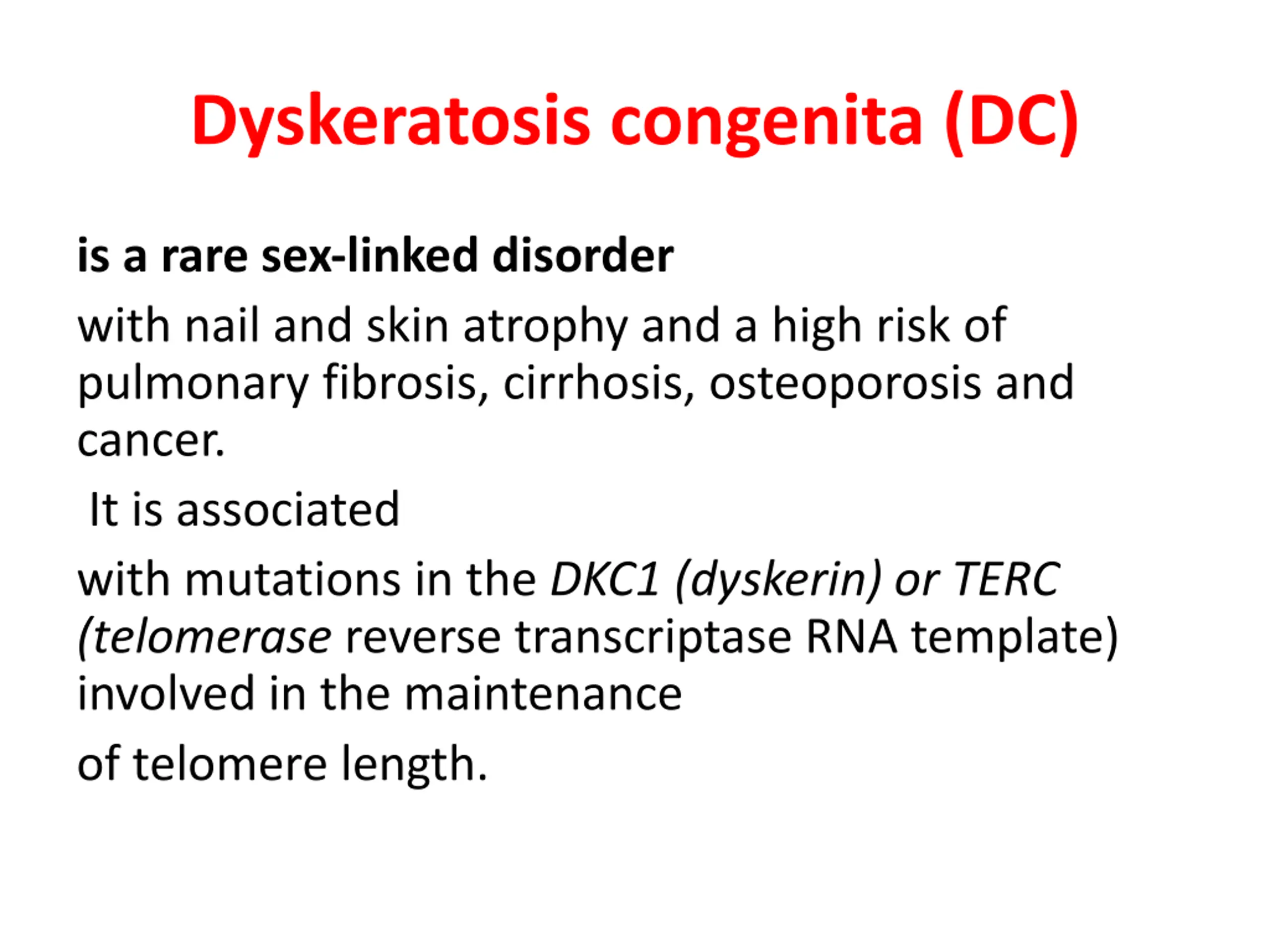 Dyskeratosis congenita (DC) is a rare sex linked disorder with nail and skin atrophy and a high risk of pulmonary fibrosis, cirrhosis, osteoporosis and cancer. It is associated with mutations in the DKC1 (dyskerin) or TERC (telomerase reverse transcriptase RNA template) involved in the maintenance of telomere length.