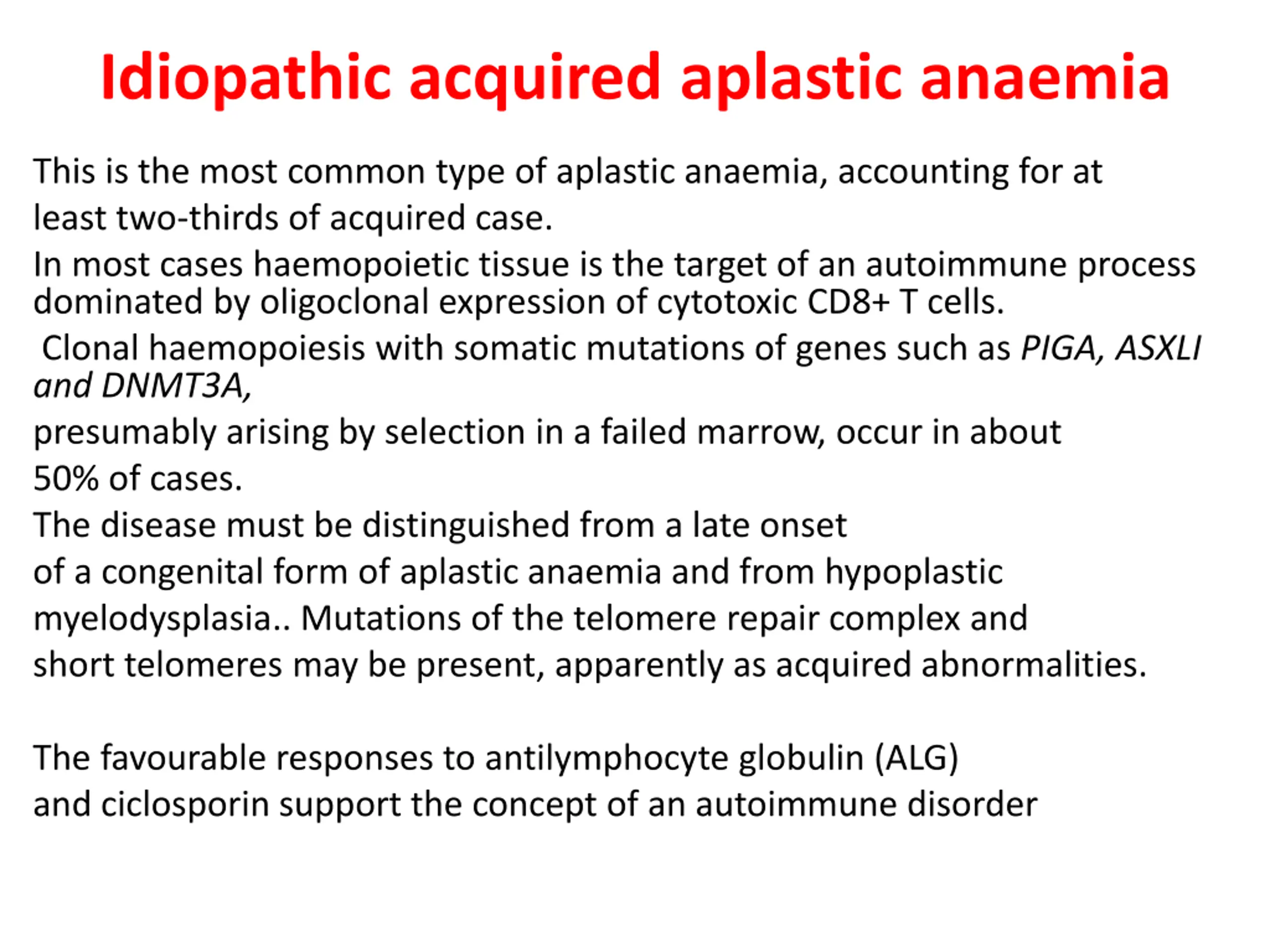 Idiopathic acquired aplastic anaemia This is the most common type of aplastic anaemia, accounting for at least two thirds of acquired case. In most cases haemopoietic tissue is the target of an autoimmune process dominated by oligoclonal expression of cytotoxic CD8+ T cells. Clonal haemopoiesis with somatic mutations of genes such as PIGA, ASXLI and DNMT3A, presumably arising by selection in a failed marrow, occur in about 50% of cases. The disease must be distinguished from a late onset of a congenital form of aplastic anaemia and from hypoplastic myelodysplasia.. Mutations of the telomere repair complex and short telomeres may be present, apparently as acquired abnormalities. The favourable responses to antilymphocyte globulin (ALG) and ciclosporin support the concept of an autoimmune disorder