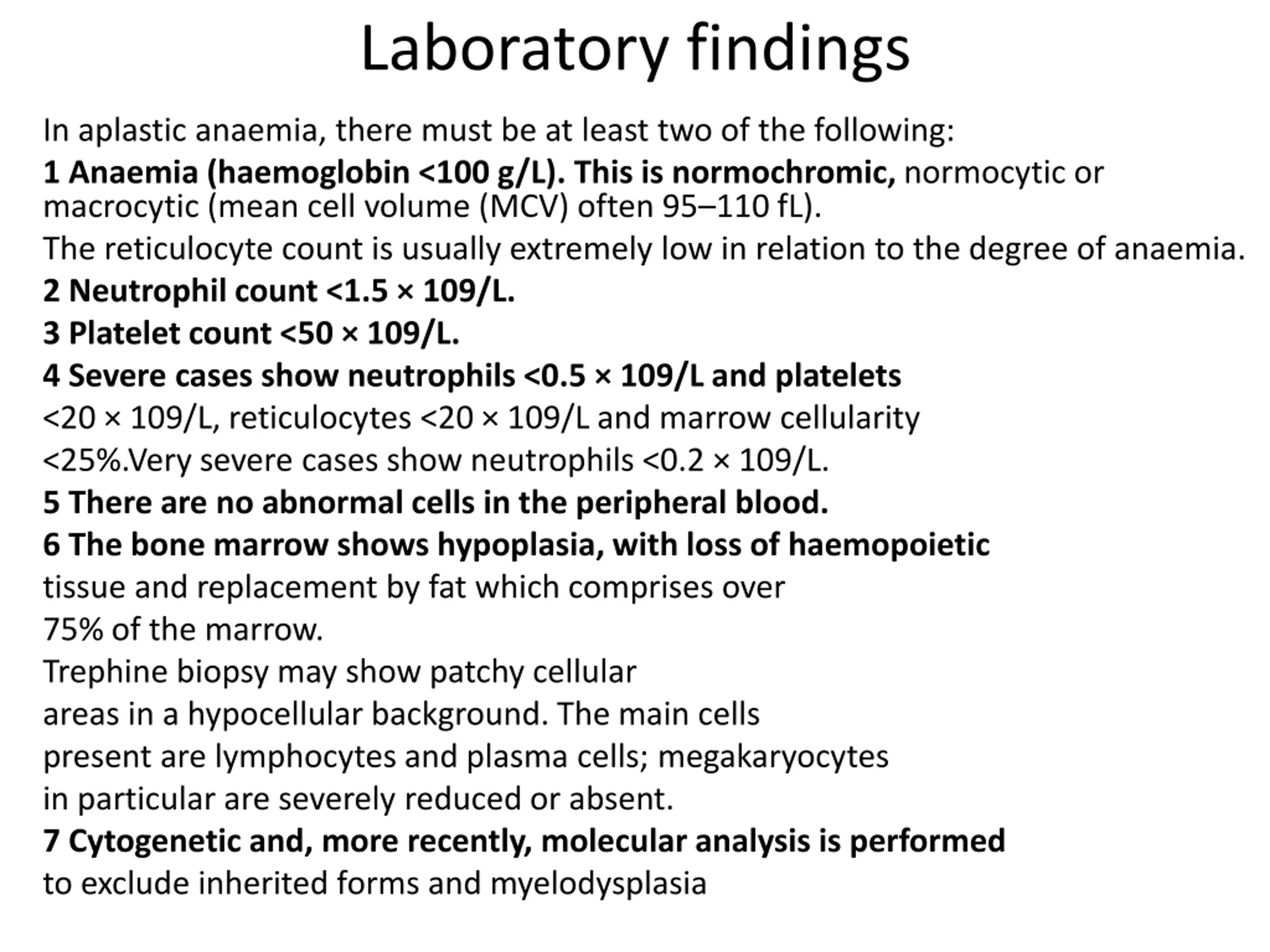 Laboratory findings In aplastic anaemia, there must be at least two of the following: 1 Anaemia (haemoglobin <100 g/L). This is normochromic, normocytic or macrocytic (mean cell volume (MCV) often 95 110 fL). The reticulocyte count is usually extremely low in relation to the degree of anaemia. 2 Neutrophil count <1.5 109/L. 3 Platelet count <50 109/L. 4 Severe cases show neutrophils <0.5 109/L and platelets <20 109/L, reticulocytes <20 109/L and marrow cellularity <25%.Very severe cases show neutrophils <0.2 109/L. 5 There are no abnormal cells in the peripheral blood. 6 The bone marrow shows hypoplasia, with loss of haemopoietic tissue and replacement by fat which comprises over 75% of the marrow. Trephine biopsy may show patchy cellular areas in a hypocellular background. The main cells present are lymphocytes and plasma cells; megakaryocytes in particular are severely reduced or absent. 7 Cytogenetic and, more recently, molecular analysis is performed to exclude inherited forms and myelodysplasia