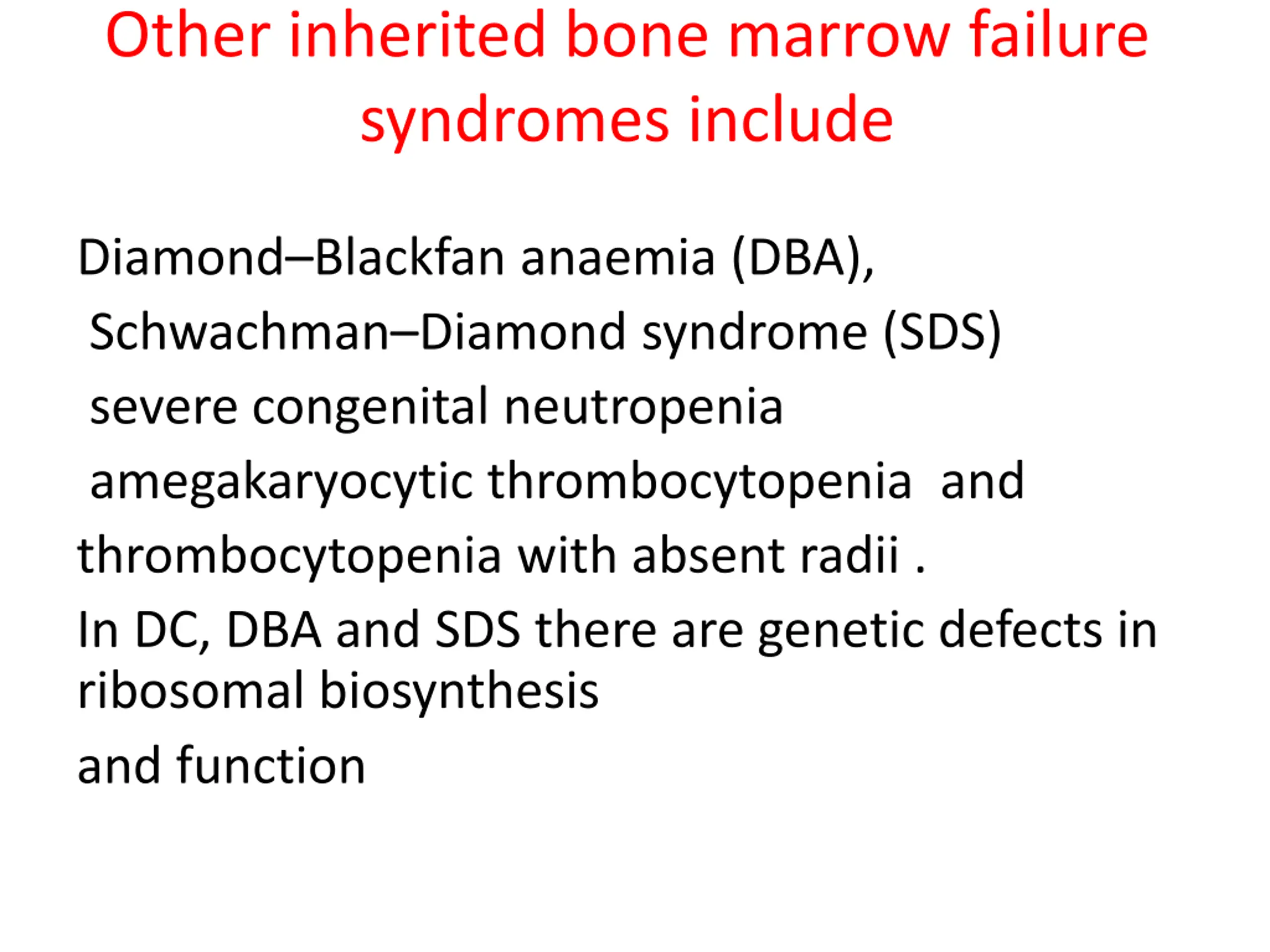 Other inherited bone marrow failure syndromes include Diamond Blackfan anaemia (DBA), Schwachman Diamond syndrome (SDS) severe congenital neutropenia amegakaryocytic thrombocytopenia and thrombocytopenia with absent radii . In DC, DBA and SDS there are genetic defects in ribosomal biosynthesis and function