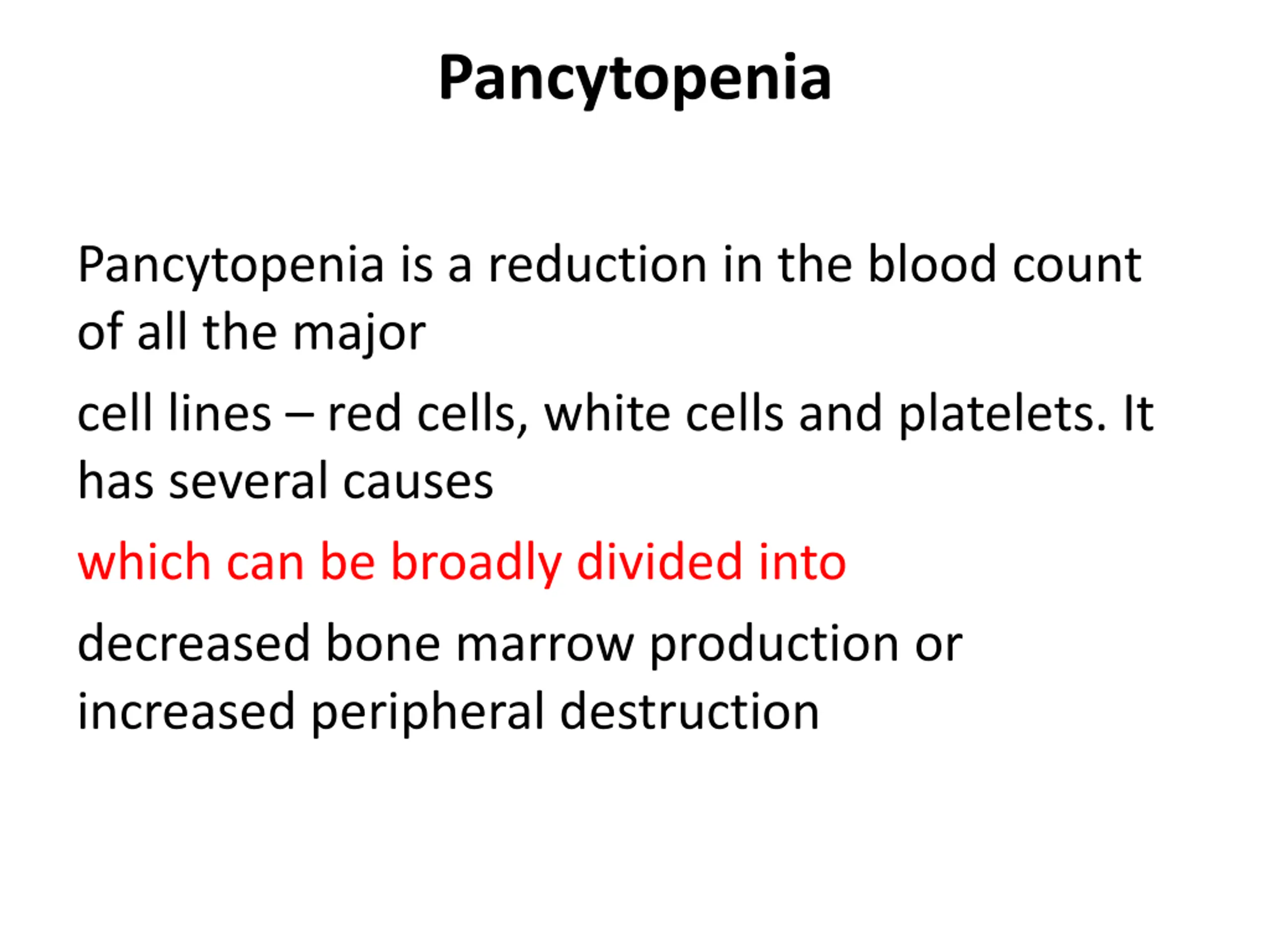 Pancytopenia Pancytopenia is a reduction in the blood count of all the major cell lines red cells, white cells and platelets. It has several causes which can be broadly divided into decreased bone marrow production or increased peripheral destruction