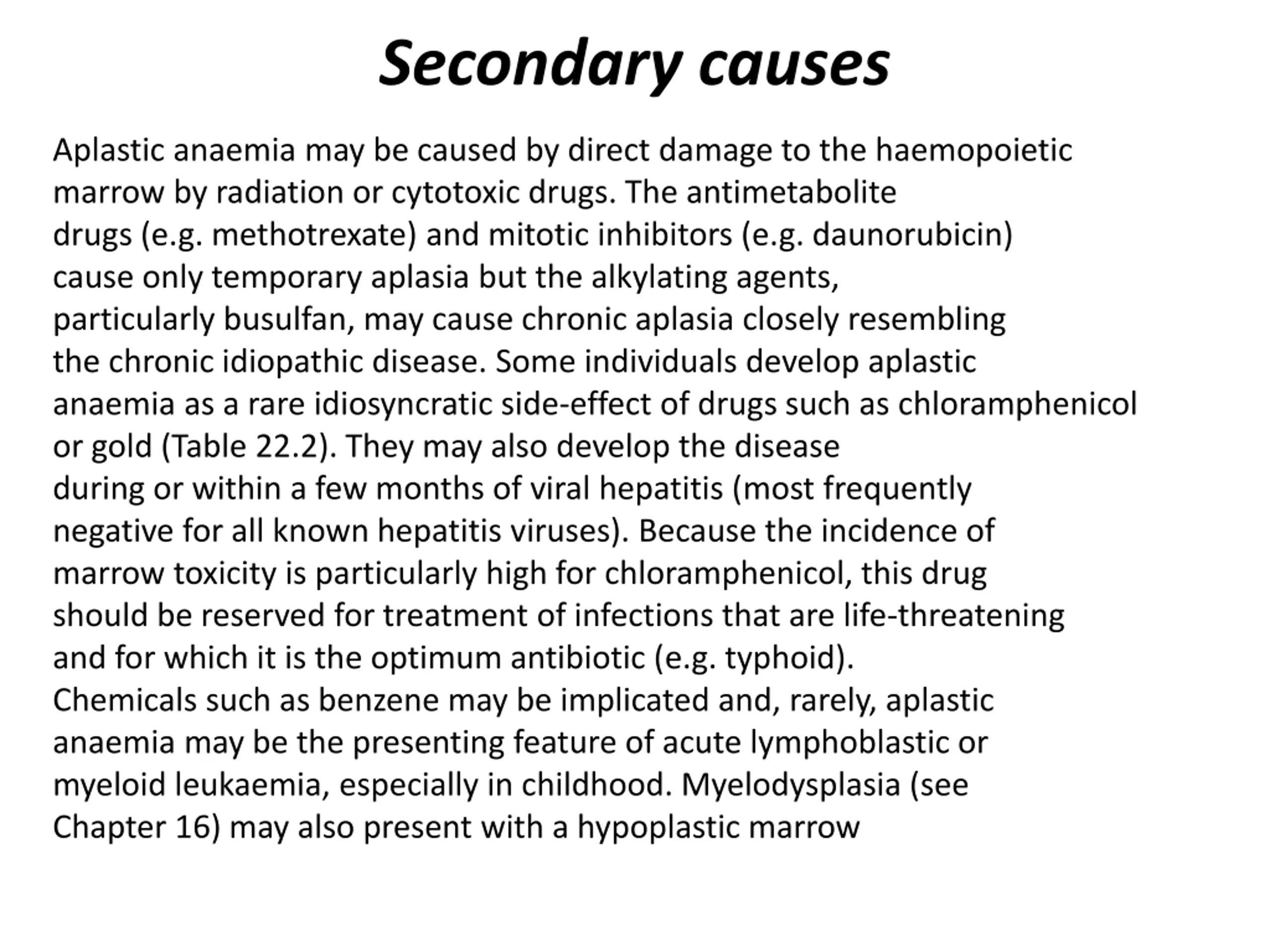 Secondary causes Aplastic anaemia may be caused by direct damage to the haemopoietic marrow by radiation or cytotoxic drugs. The antimetabolite drugs (e.g. methotrexate) and mitotic inhibitors (e.g. daunorubicin) cause only temporary aplasia but the alkylating agents, particularly busulfan, may cause chronic aplasia closely resembling the chronic idiopathic disease. Some individuals develop aplastic anaemia as a rare idiosyncratic side effect of drugs such as chloramphenicol or gold (Table 22.2). They may also develop the disease during or within a few months of viral hepatitis (most frequently negative for all known hepatitis viruses). Because the incidence of marrow toxicity is particularly high for chloramphenicol, this drug should be reserved for treatment of infections that are life threatening and for which it is the optimum antibiotic (e.g. typhoid). Chemicals such as benzene may be implicated and, rarely, aplastic anaemia may be the presenting feature of acute lymphoblastic or myeloid leukaemia, especially in childhood. Myelodysplasia (see Chapter 16) may also present with a hypoplastic marrow