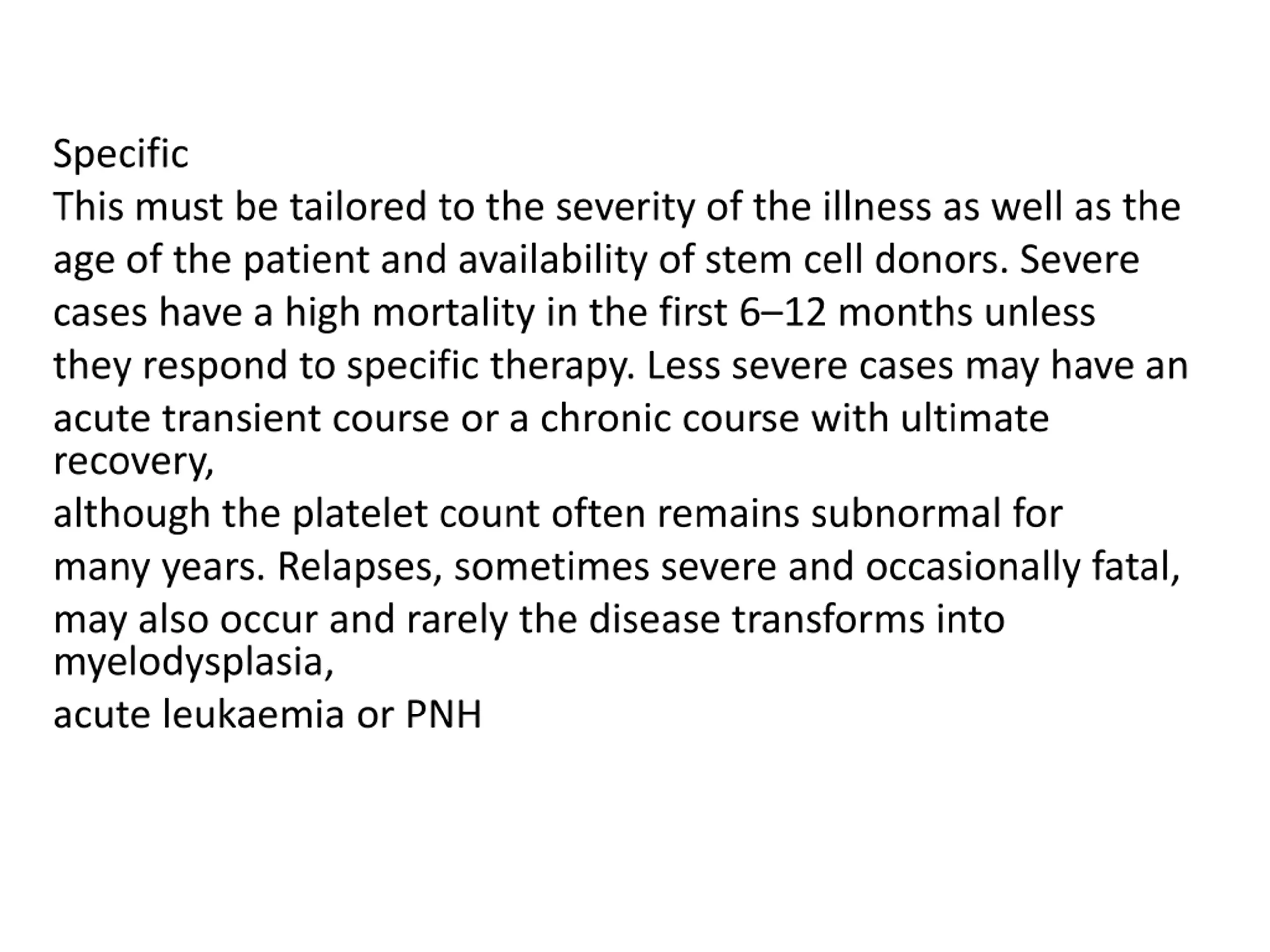 Specific This must be tailored to the severity of the illness as well as the age of the patient and availability of stem cell donors. Severe cases have a high mortality in the first 6 12 months unless they respond to specific therapy. Less severe cases may have an acute transient course or a chronic course with ultimate recovery, although the platelet count often remains subnormal for many years. Relapses, sometimes severe and occasionally fatal, may also occur and rarely the disease transforms into myelodysplasia, acute leukaemia or PNH
