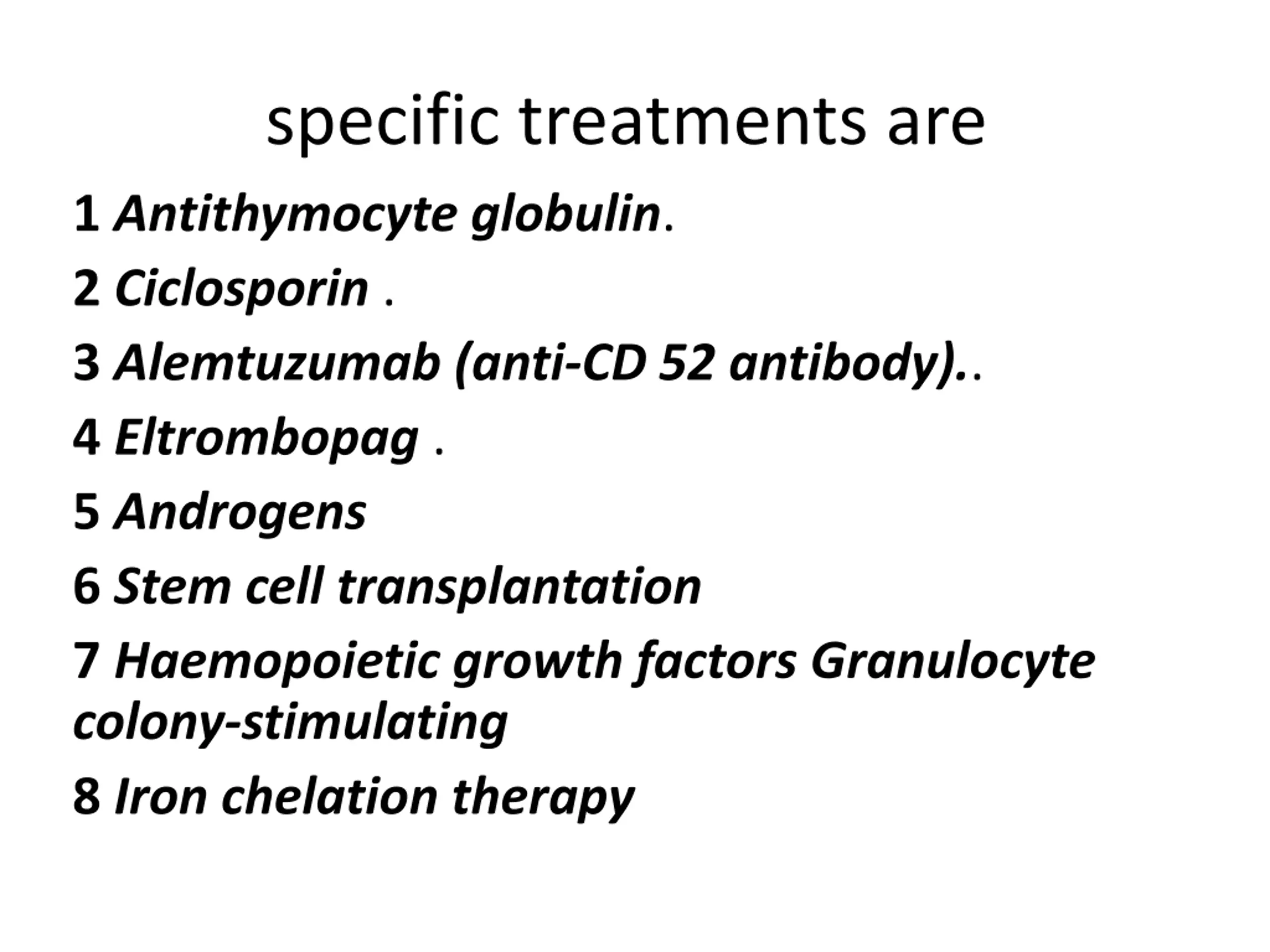 specific treatments are 1 Antithymocyte globulin. 2 Ciclosporin . 3 Alemtuzumab (anti CD 52 antibody).. 4 Eltrombopag . 5 Androgens 6 Stem cell transplantation 7 Haemopoietic growth factors Granulocyte colony stimulating 8 Iron chelation therapy
