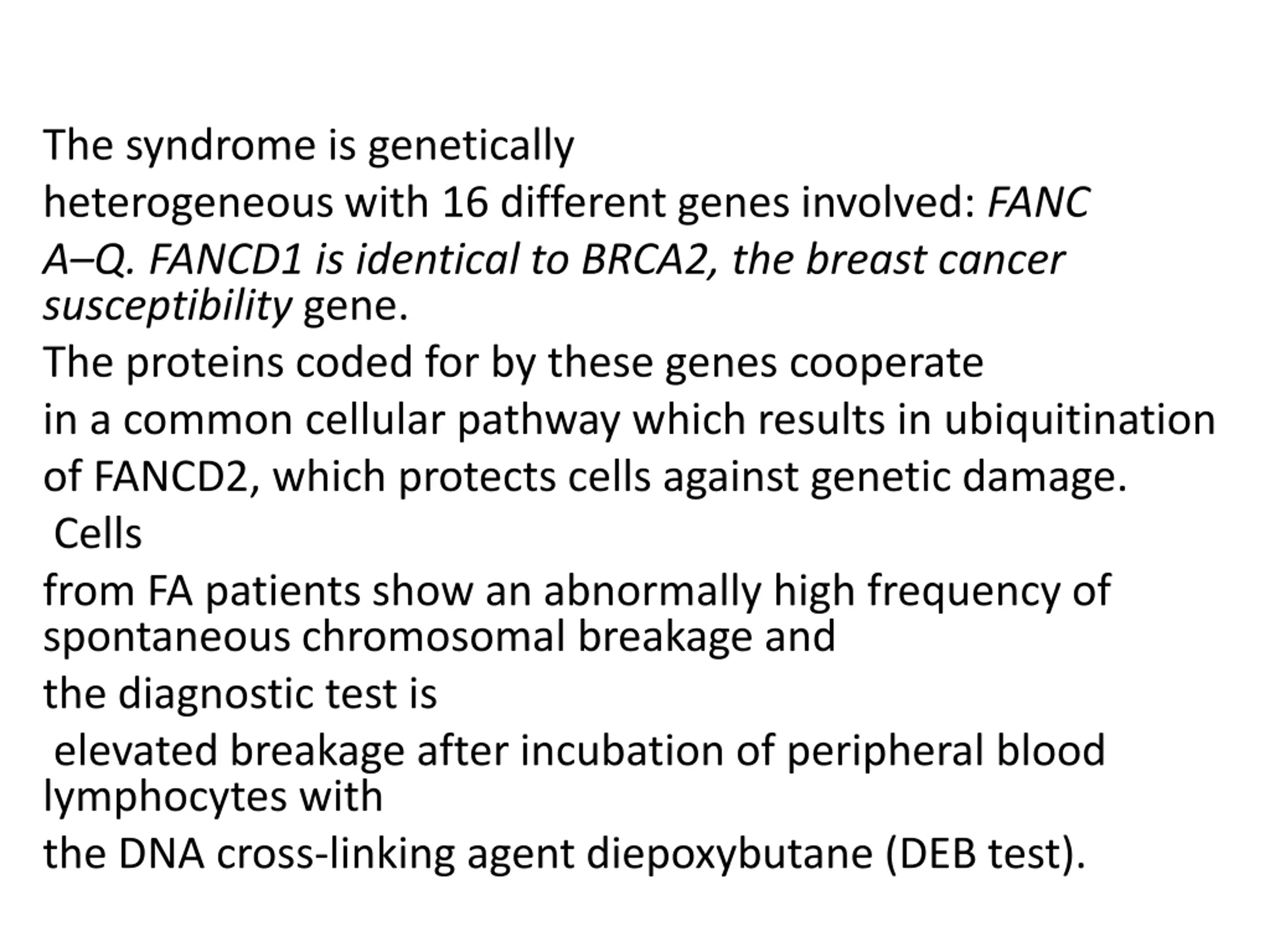 The syndrome is genetically heterogeneous with 16 different genes involved: FANC A Q. FANCD1 is identical to BRCA2, the breast cancer susceptibility gene. The proteins coded for by these genes cooperate in a common cellular pathway which results in ubiquitination of FANCD2, which protects cells against genetic damage. Cells from FA patients show an abnormally high frequency of spontaneous chromosomal breakage and the diagnostic test is elevated breakage after incubation of peripheral blood lymphocytes with the DNA cross linking agent diepoxybutane (DEB test).
