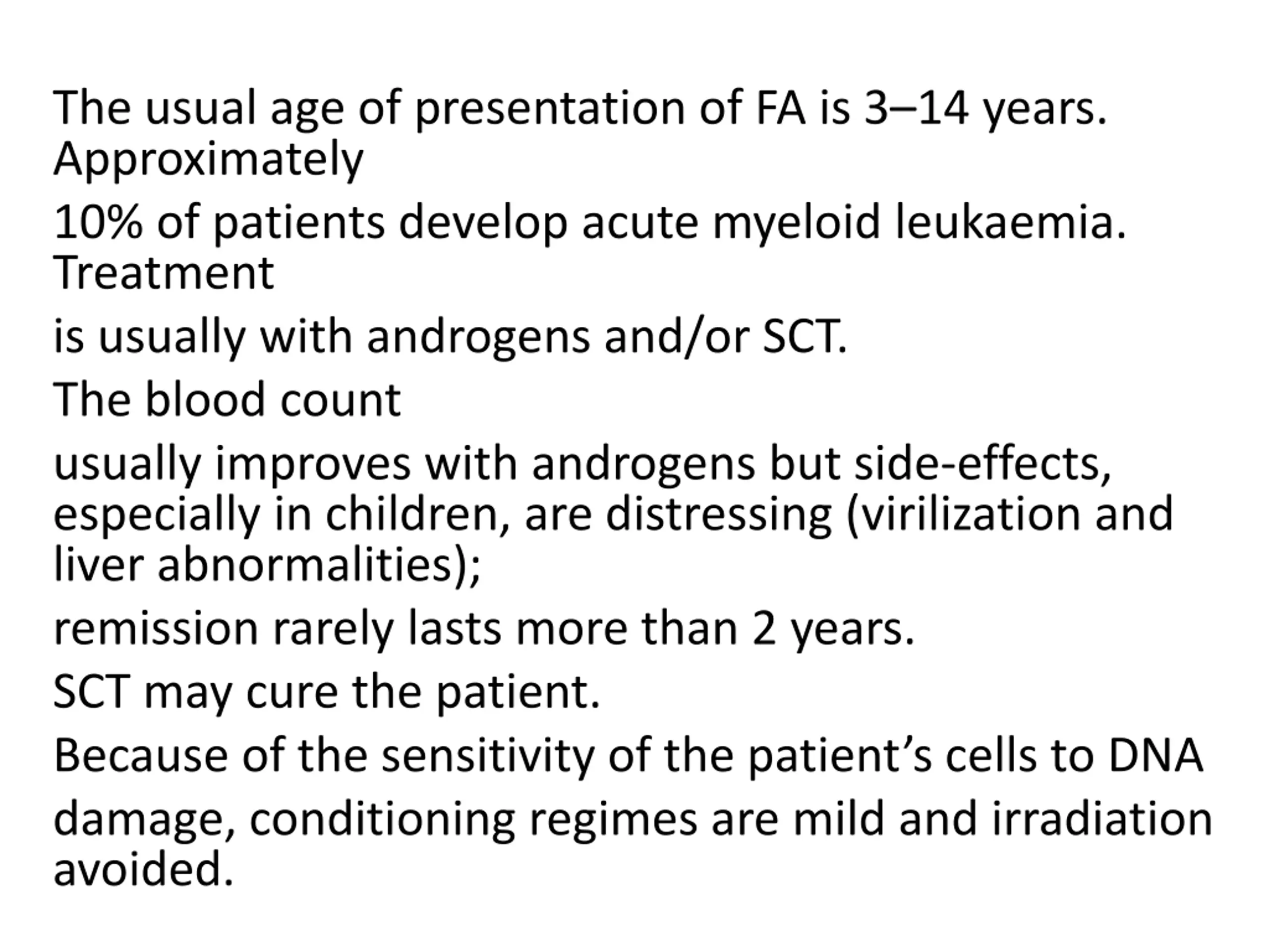 The usual age of presentation of FA is 314 years. Approximately 10% of patients develop acute myeloid leukaemia. Treatment is usually with androgens and/or SCT. The blood count usually improves with androgens but side effects, especially in children, are distressing (virilization and liver abnormalities); remission rarely lasts more than 2 years. SCT may cure the patient. Because of the sensitivity of the patient s cells to DNA damage, conditioning regimes are mild and irradiation avoided.