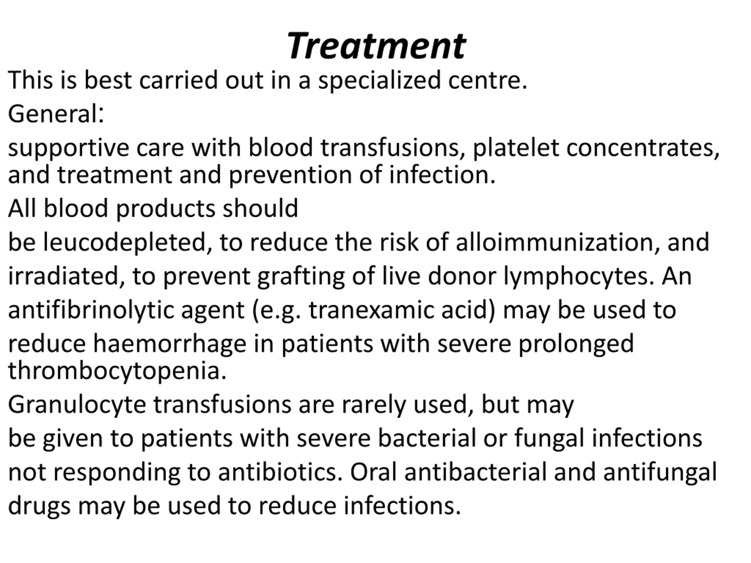 Treatment This is best carried out in a specialized centre. : General supportive care with blood transfusions, platelet concentrates, and treatment and prevention of infection. All blood products should be leucodepleted, to reduce the risk of alloimmunization, and irradiated, to prevent grafting of live donor lymphocytes. An antifibrinolytic agent (e.g. tranexamic acid) may be used to reduce haemorrhage in patients with severe prolonged thrombocytopenia. Granulocyte transfusions are rarely used, but may be given to patients with severe bacterial or fungal infections not responding to antibiotics. Oral antibacterial and antifungal drugs may be used to reduce infections.