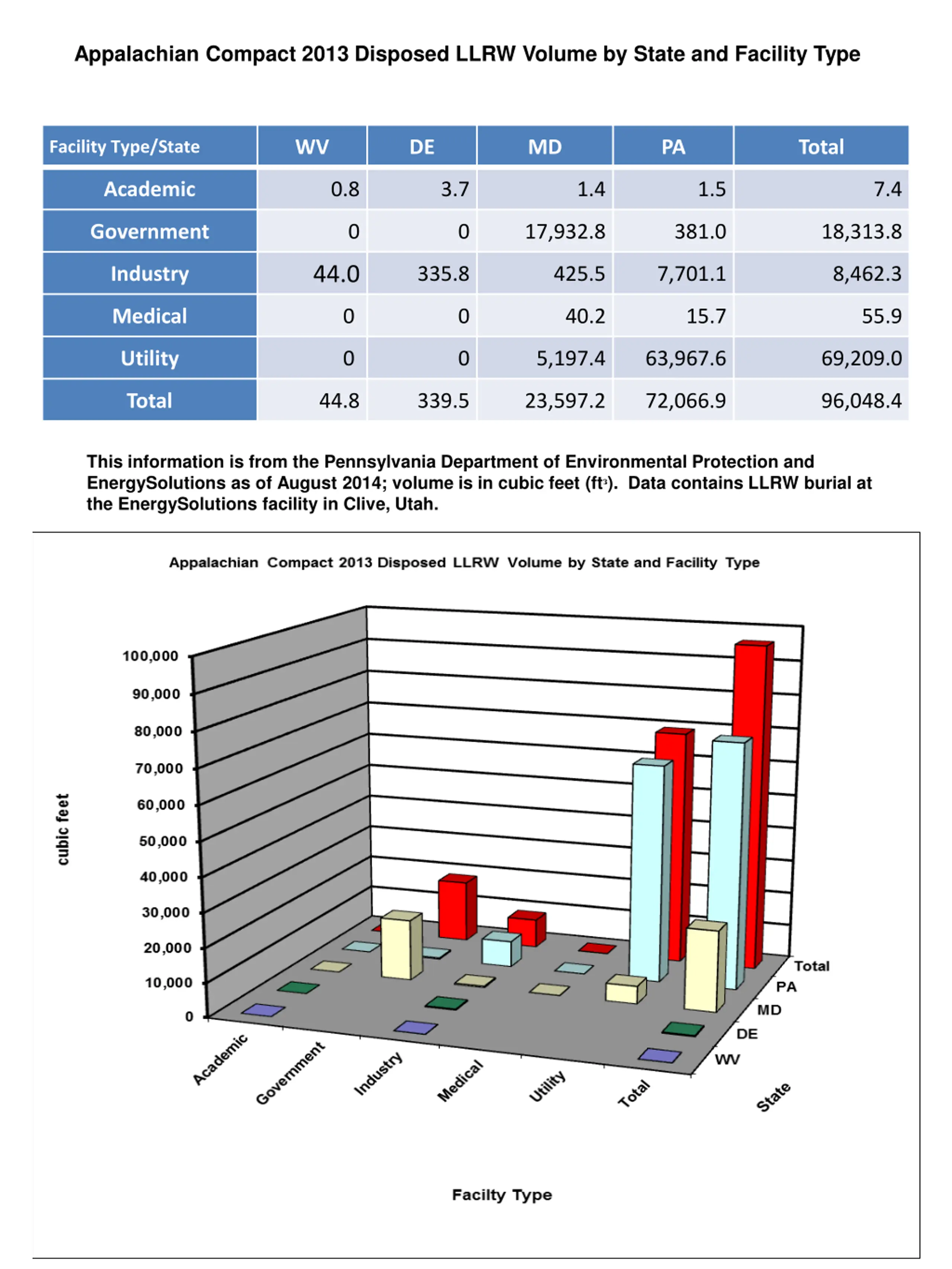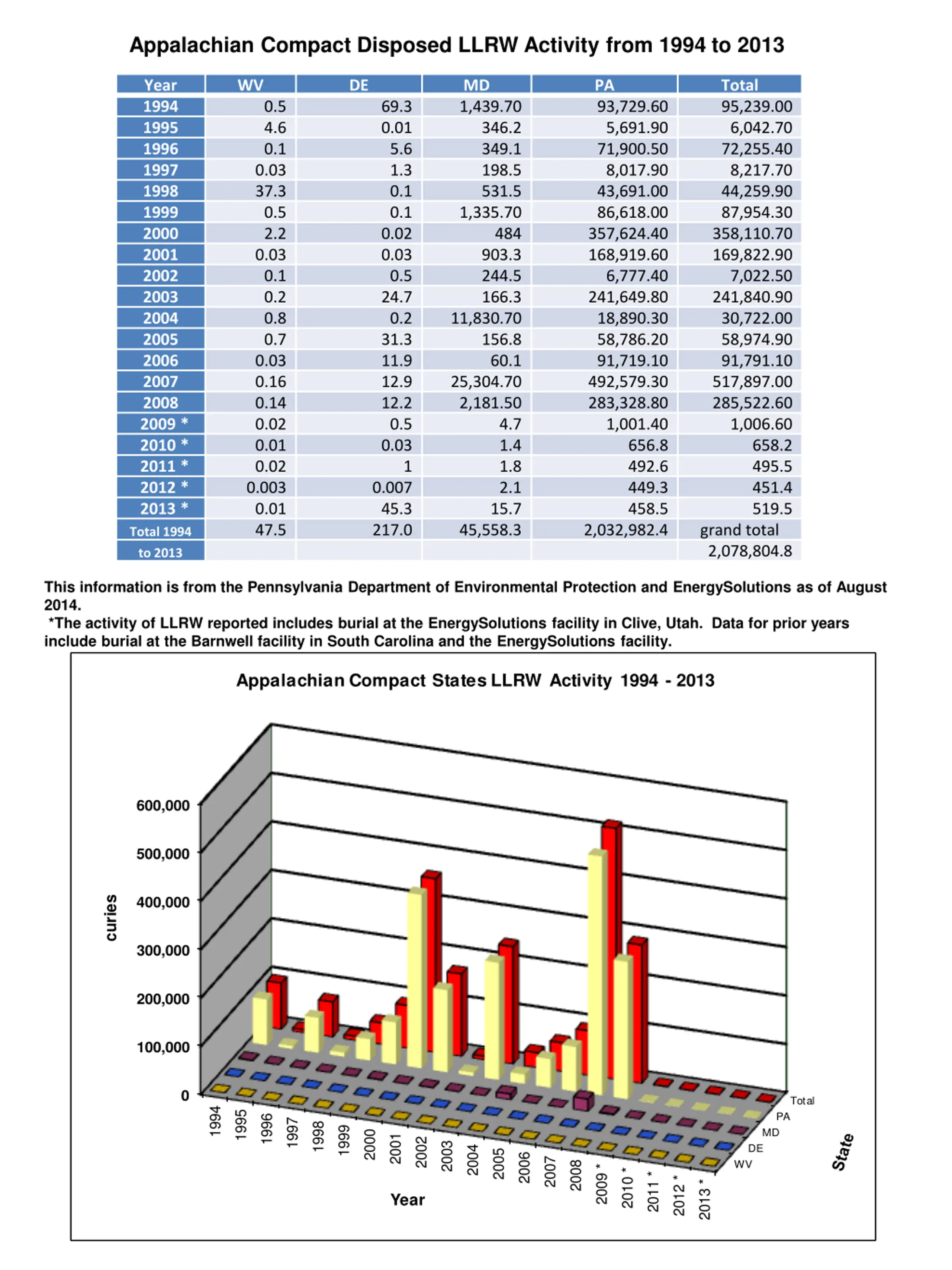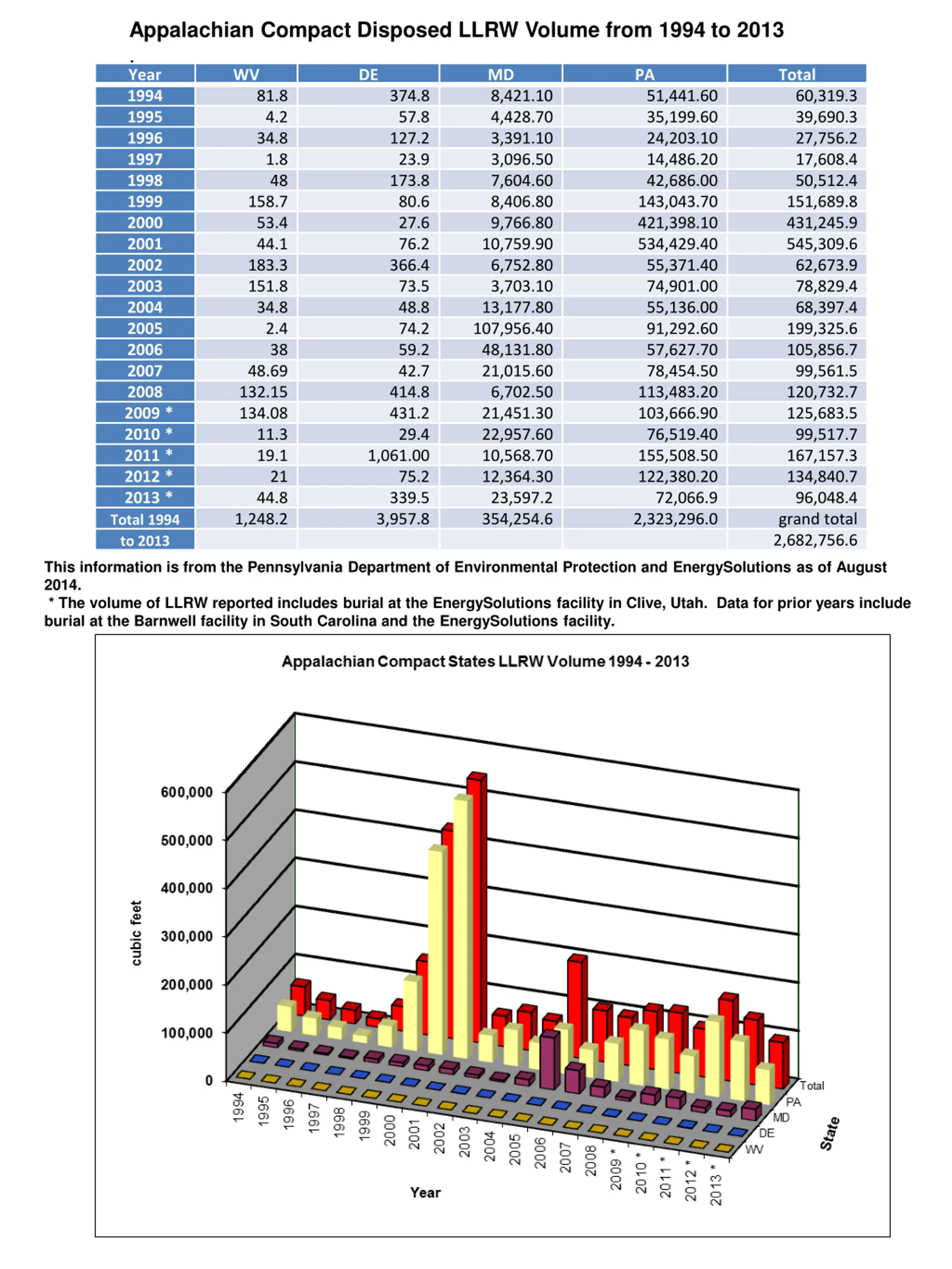Appalachian Compact Disposed LLRW Volume from 1994 to 2013 . Year 1994 1995 1996 1997 1998 1999 2000 2001 2002 2003 2004 2005 2006 2007 2008 2009 * 2010 * 2011 * 2012 * 2013 * Total 1994 to 2013 WV DE MD 8,421.10 4,428.70 3,391.10 3,096.50 7,604.60 8,406.80 9,766.80 10,759.90 6,752.80 3,703.10 13,177.80 107,956.40 48,131.80 21,015.60 6,702.50 21,451.30 22,957.60 10,568.70 12,364.30 23,597.2 354,254.6 PA Total 60,319.3 39,690.3 27,756.2 17,608.4 50,512.4 151,689.8 431,245.9 545,309.6 62,673.9 78,829.4 68,397.4 199,325.6 105,856.7 99,561.5 120,732.7 125,683.5 99,517.7 167,157.3 134,840.7 96,048.4 grand total 2,682,756.6 81.8 4.2 34.8 1.8 48 158.7 53.4 44.1 183.3 151.8 34.8 2.4 374.8 57.8 127.2 23.9 173.8 80.6 27.6 76.2 366.4 73.5 48.8 74.2 59.2 42.7 414.8 431.2 29.4 51,441.60 35,199.60 24,203.10 14,486.20 42,686.00 143,043.70 421,398.10 534,429.40 55,371.40 74,901.00 55,136.00 91,292.60 57,627.70 78,454.50 113,483.20 103,666.90 76,519.40 155,508.50 122,380.20 72,066.9 2,323,296.0 38 48.69 132.15 134.08 11.3 19.1 1,061.00 75.2 339.5 3,957.8 21 44.8 1,248.2 This information is from the Pennsylvania Department of Environmental Protection and EnergySolutions as of August 2014. * The volume of LLRW reported includes burial at the EnergySolutions facility in Clive, Utah. Data for prior years include burial at the Barnwell facility in South Carolina and the EnergySolutions facility.