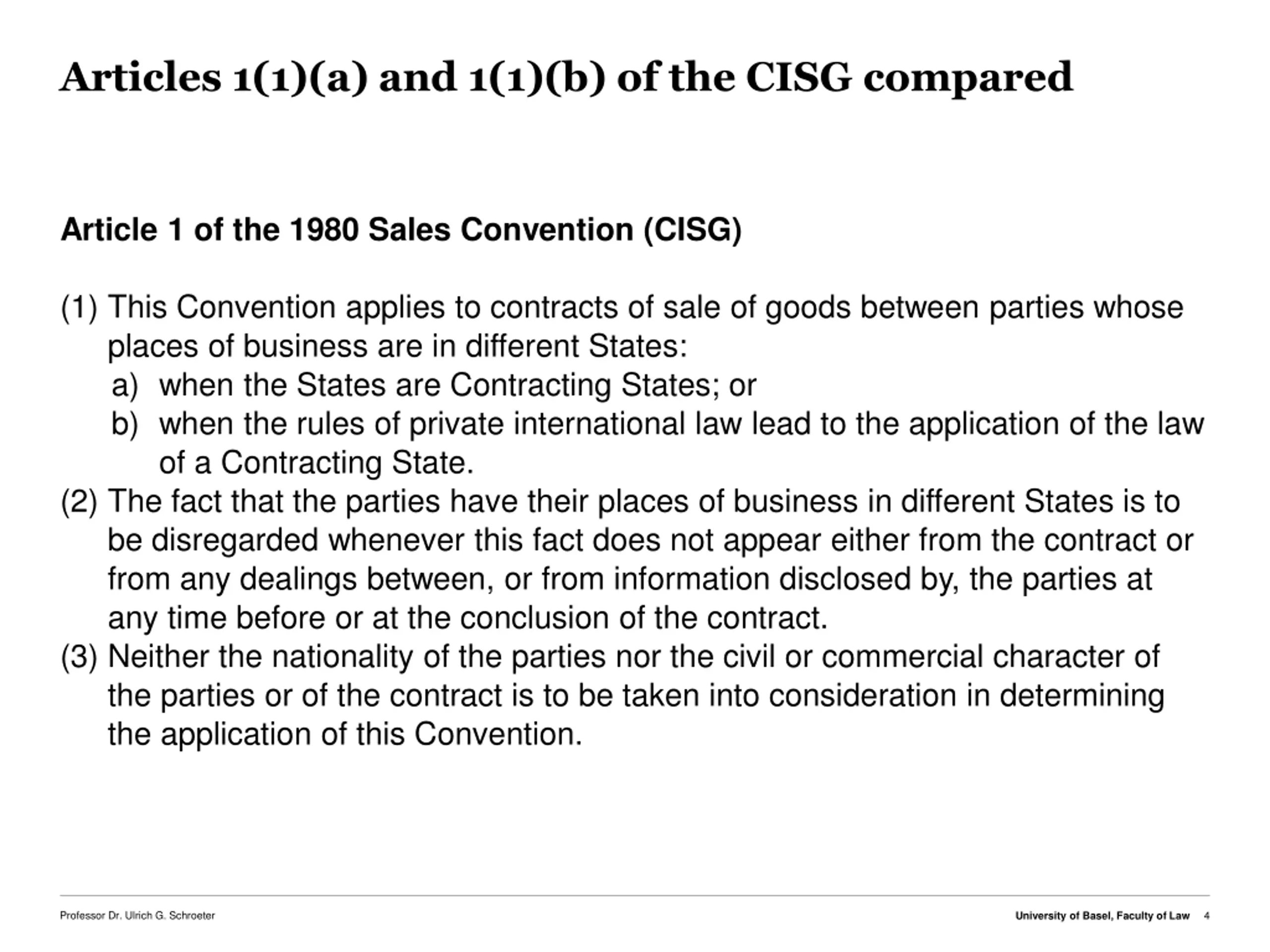 Articles 1(1)(a) and 1(1)(b) of the CISG compared Article 95 of the 1980 Sales Convention (CISG) Any State may declare at the time of the deposit of its instrument of ratification, acceptance, approval or accession that it will not be bound by subparagraph (1)(b) of article 1 of this Convention. Professor Dr. Ulrich G. Schroeter 7 University of Basel, Faculty of Law