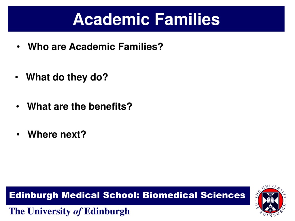 Academic Families Who are Academic Families? What do they do? What are the benefits? Where next? Edinburgh Medical School: Biomedical Sciences The University of Edinburgh