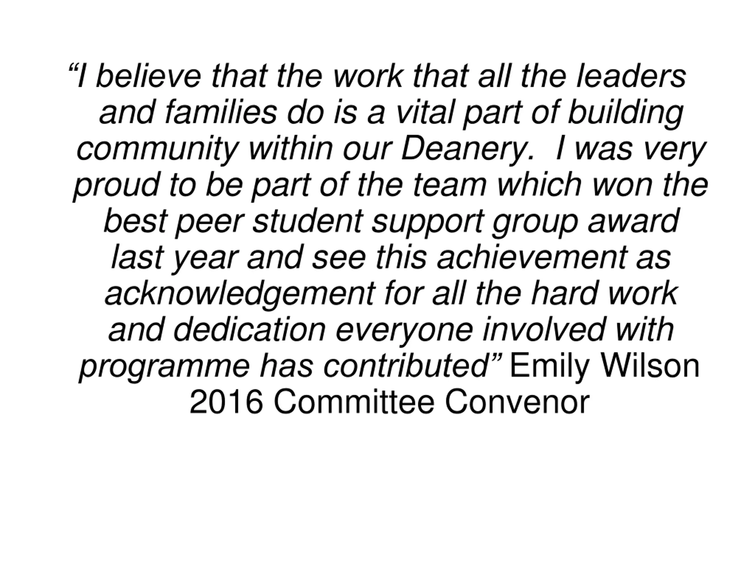 I believe that the work that all the leaders and families do is a vital part of building community within our Deanery. I was very proud to be part of the team which won the best peer student support group award last year and see this achievement as acknowledgement for all the hard work and dedication everyone involved with programme has contributed Emily Wilson 2016 Committee Convenor