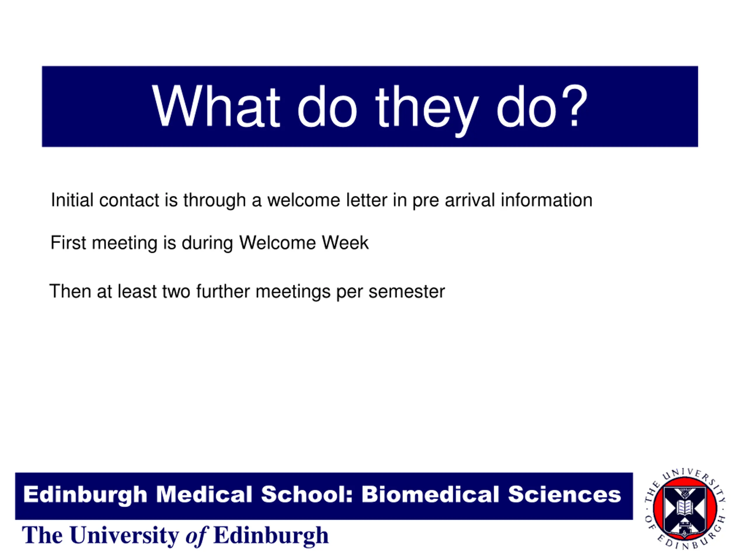 What do they do? Initial contact is through a welcome letter in pre arrival information First meeting is during Welcome Week Then at least two further meetings per semester Edinburgh Medical School: Biomedical Sciences The University of Edinburgh