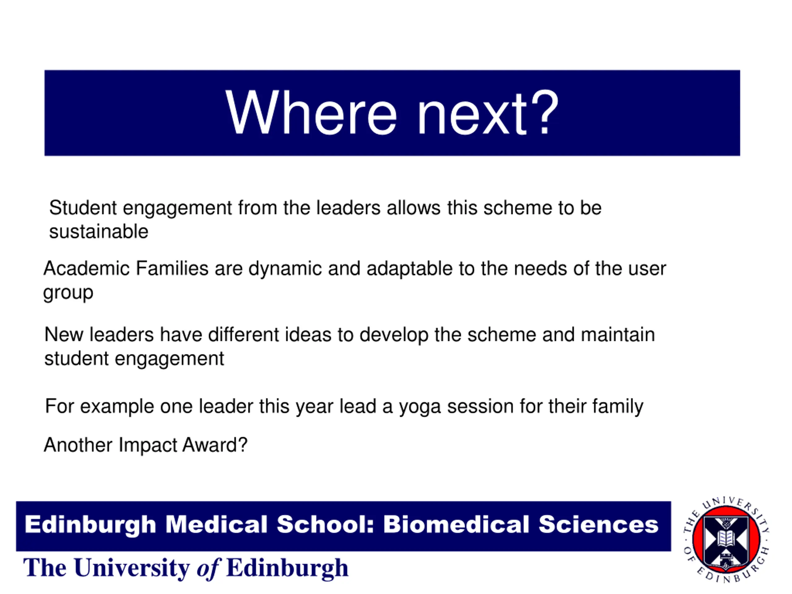 Where next? Student engagement from the leaders allows this scheme to be sustainable Academic Families are dynamic and adaptable to the needs of the user group New leaders have different ideas to develop the scheme and maintain student engagement For example one leader this year lead a yoga session for their family Another Impact Award? Edinburgh Medical School: Biomedical Sciences The University of Edinburgh