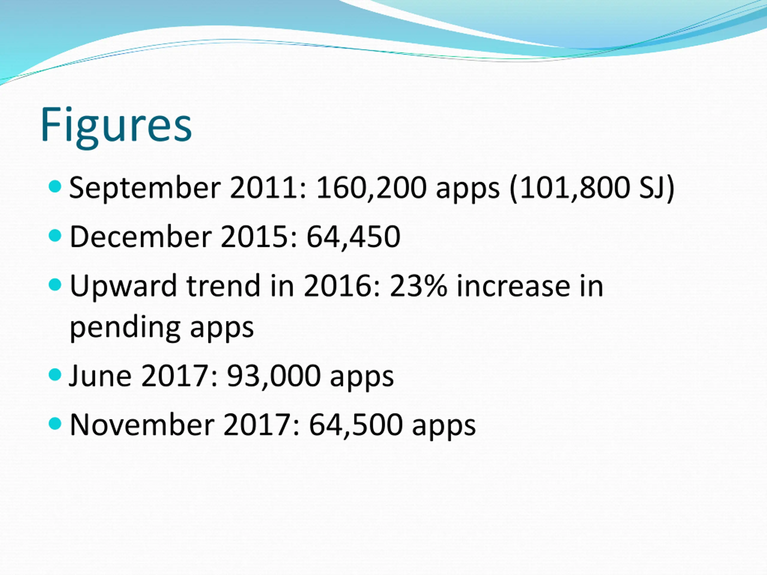 Figures September 2011: 160,200 apps (101,800 SJ) December 2015: 64,450 Upward trend in 2016: 23% increase in pending apps June 2017: 93,000 apps November 2017: 64,500 apps
