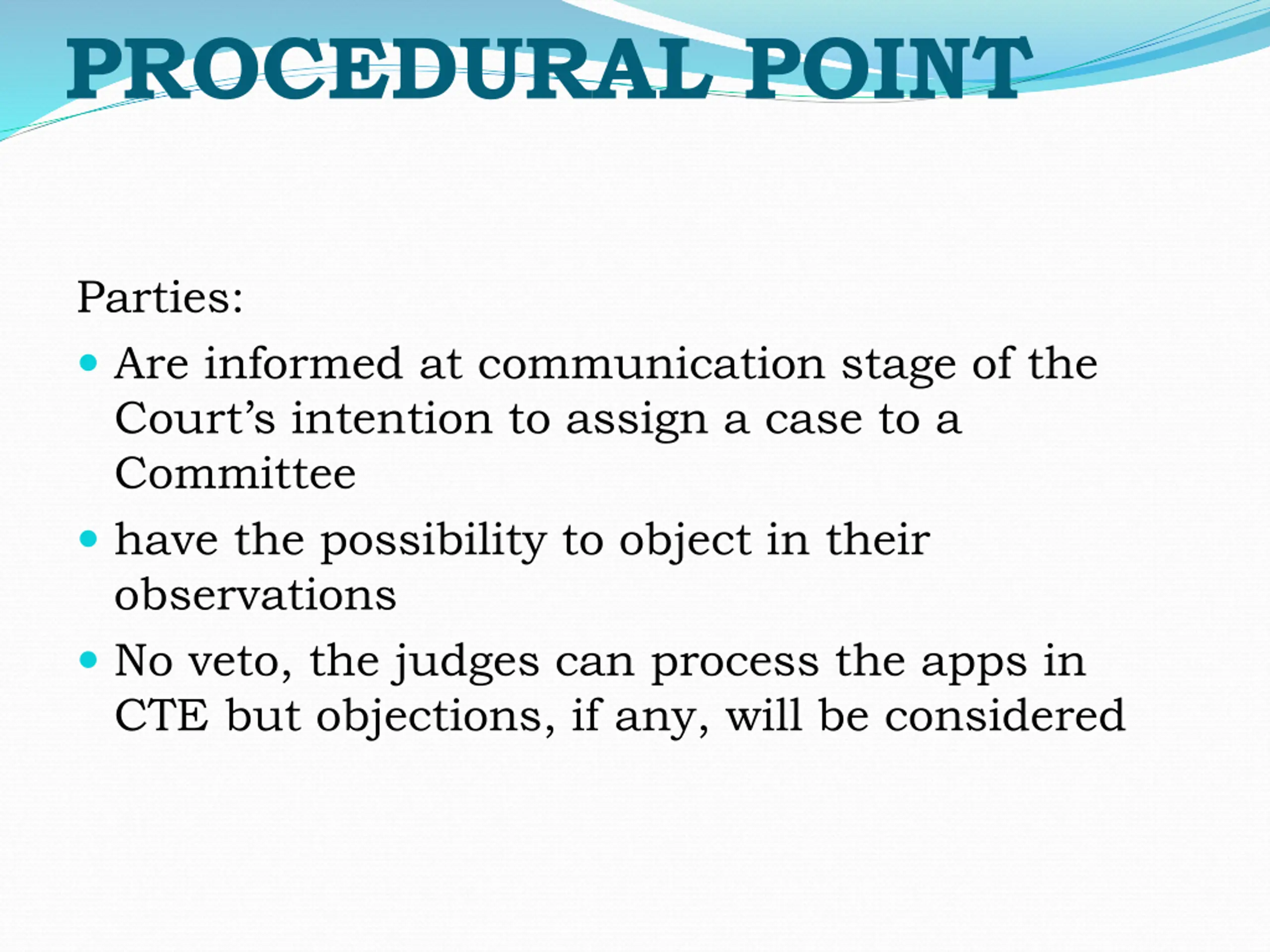PROCEDURAL POINT Parties: Are informed at communication stage of the Court s intention to assign a case to a Committee have the possibility to object in their observations No veto, the judges can process the apps in CTE but objections, if any, will be considered