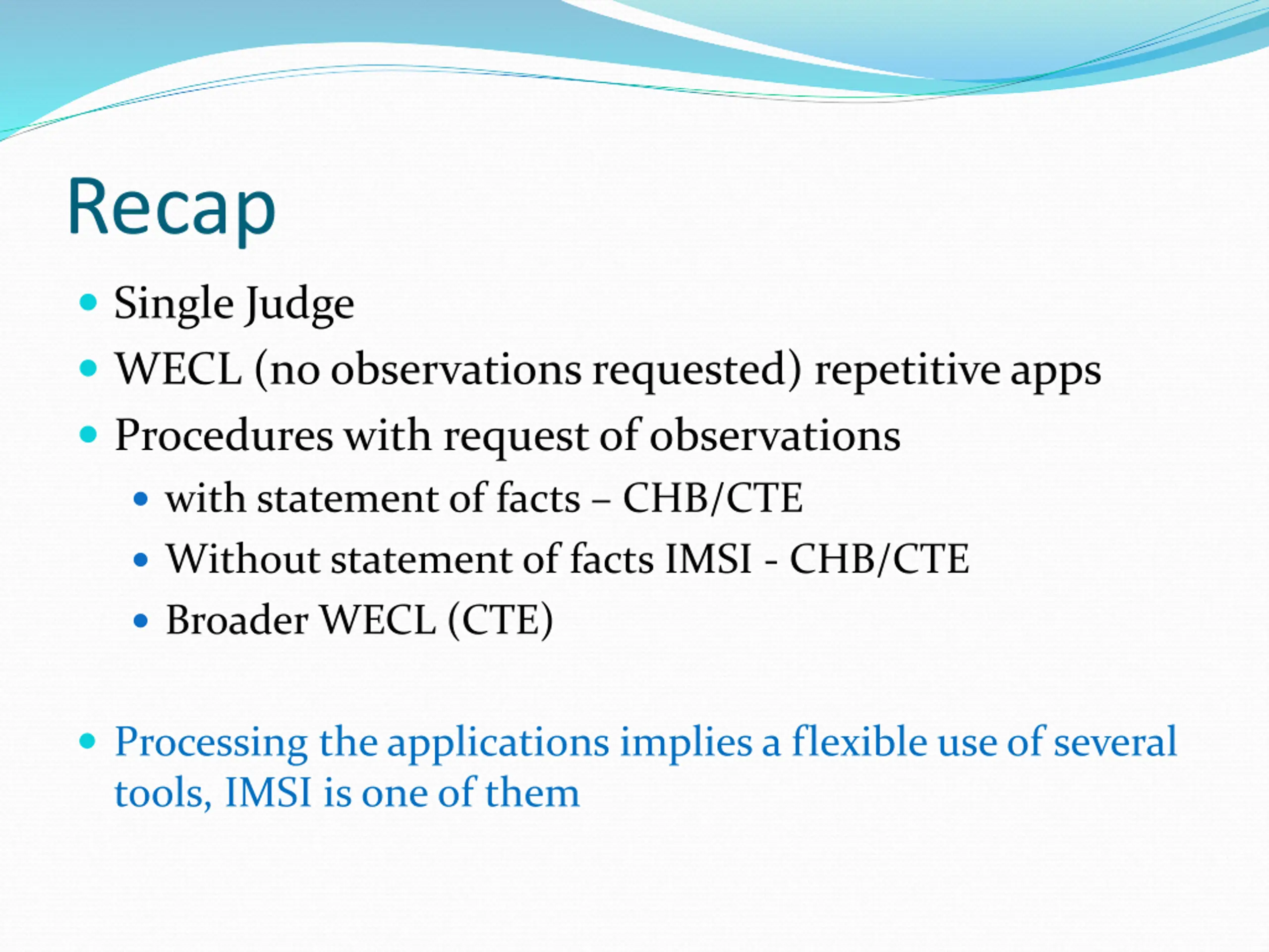 Recap Single Judge WECL (no observations requested) repetitiveapps Procedureswith requestof observations with statement of facts CHB/CTE Without statement of facts IMSI - CHB/CTE Broader WECL (CTE) Processing the applications implies a flexible use of several tools, IMSI is one of them