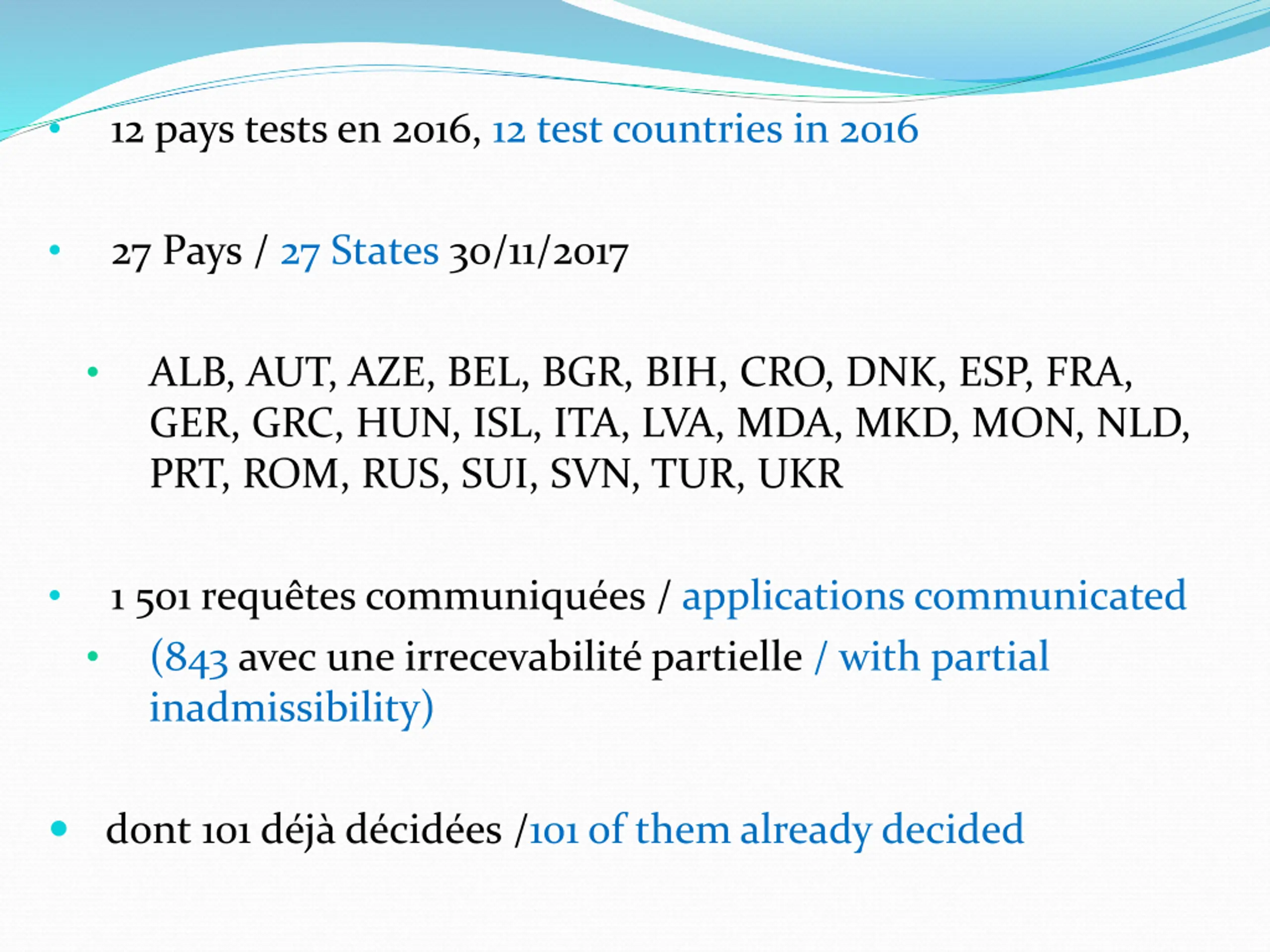 12 pays tests en 2016, 12 test countries in 2016 27 Pays / 27 States 30/11/2017 ALB, AUT, AZE, BEL, BGR, BIH, CRO, DNK, ESP, FRA, GER, GRC, HUN, ISL, ITA, LVA, MDA, MKD, MON, NLD, PRT, ROM, RUS, SUI, SVN, TUR, UKR 1 501 requ tes communiqu es / applications communicated (843 avec une irrecevabilit partielle / with partial inadmissibility) dont 101 d j d cid es /101 of them already decided